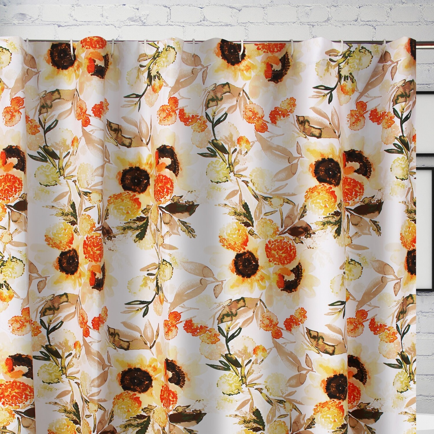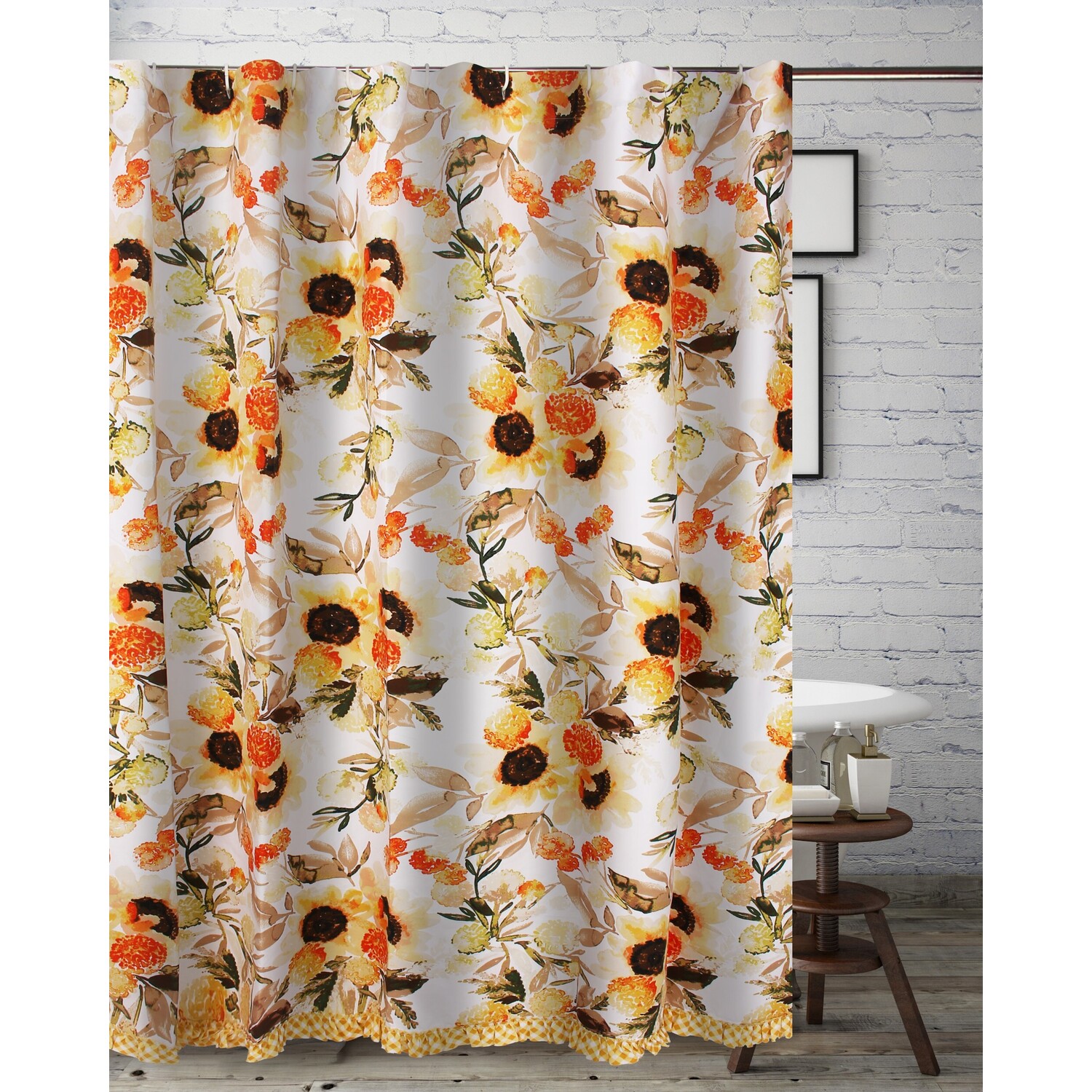 Wrap your room in sunshine. With watercolor sunflowers on the face, Somerset transforms your space with country farmhouse style. Somerset brings to mind furrowed fields of America's heartland and adds a subtle seasonal accent to your room with pops of color. Reinforced button holes along the top seam for easy hanging with standard shower curtain hooks (hooks not included). Designed for use with a waterproof liner (liner not included). Dimensions: Shower curtain measures approximately 72 x 72"es. Machine Wash. 100% Microfiber polyester shell with 100% polyester fill. Machine washable. 100% brushed microfiber. BathShower curtain measures 72 x 72"es.Reinforced button holes along the top for ease of hanging and durability.Designed for use with a waterproof liner (not included)Machine washable.
