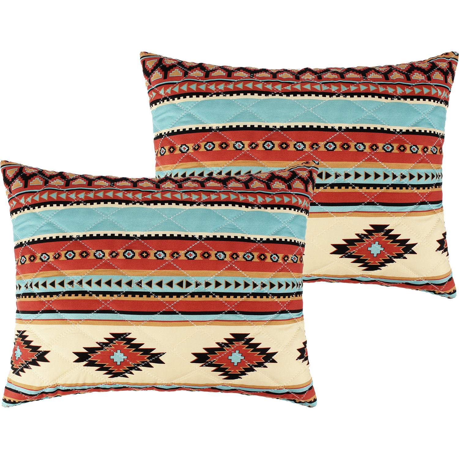 Spice up your space with the colorful Red Rock pillow sham. Primitive geometric motifs like jewels adorn festive stripes of turquoise, gold, orange, sandstone, and clay. Side zipper holds your pillow in place and makes each Red Rock sham reversible. Inspired by the rugged landscape of the great Southwest, unique diamond railroad quilting pattern adds loft and surface interest. 100% microfiber face and back with 100% polyester fill. Dimensions: Standard sham measures 20x26"es; King sham measures 20x36"es (all dimensions +/- 1"). Machine Wash. Imported.ShamDimensions: Standard sham 20x26"es; King sham 20x36"es (+/- 2-inches)Double down on the look with extra pillow shams!Zipper along the side to hold your pillow in place makes these shams truly reversible so you easily change up the look of your bedPREWASHED and pre-shrunk for a soft, comfortable feel and a perfect fit right out of the packageMachine washable
