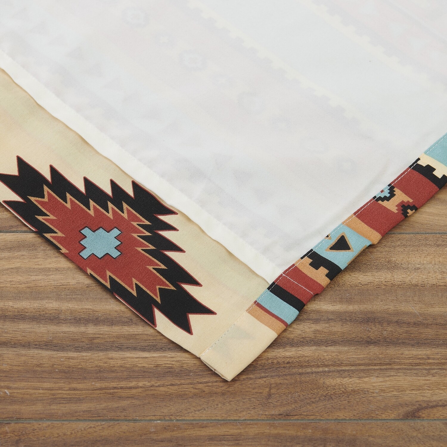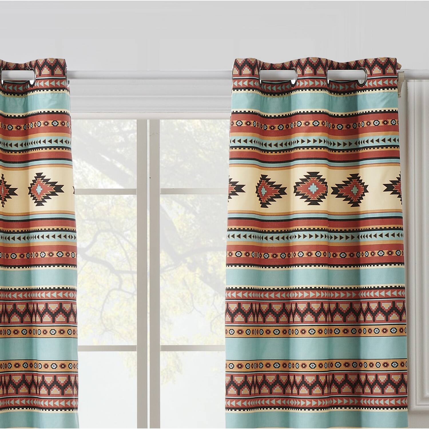 Spice up your space with the colorful Red Rock curtain panel set. Primitive geometric motifs like jewels adorn festive stripes of turquoise, gold, orange, sandstone, and clay. Perfect for adding that boho Southwest vibe to your bedroom, family room, living room, den or office. Set includes two panels and two tiebacks. Bronze-colored grommets along the top accommodate almost any curtain rod for hanging. Lined for increased privacy and sun protection. Dimensions: Each panel measures 42"es wide and 84"es long (x2), for a total window coverage area of 84"es x 84"es. 84-inch drop length is measured from the top of the grommet's 1.57-inch (40mm) opening and there is a one-inch header above, so the vertical length is actually 85"es. Set includes two tie backs, each three"es wide and 24"es long each. All dimensions +/- 2"es. Face fabric is 100% brushed microfiber. Liner is 100% brushed microfiber. Machine Wash.WindowEach 4-piece set features two panels and two tie backsDimensions: Each panel measures 84"es long x 42"es wide (x2). Overall dimensions of set, 84"es x 84"es.Lined for increased privacy and sun protectionMachine washable