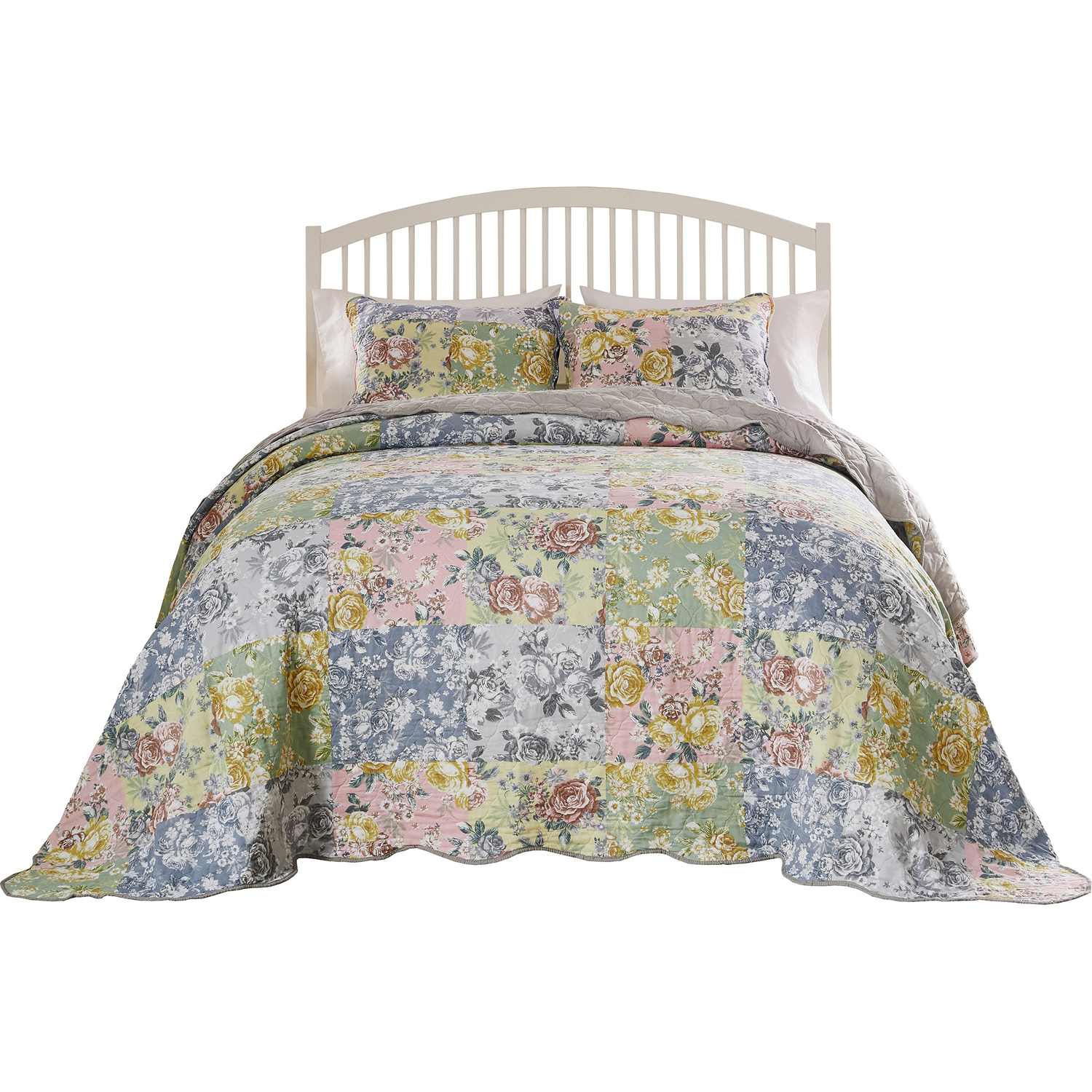 Constructed from cotton fabric with scalloped borders and a cotton-rich fill, Emma features florals in a patchwork of alluring hues. Lightweight for year-round layering and comfort, this new classic from Greenland Home Fashions will feel right at home with a variety of interior decor themes. The patchwork print is overstitched in a vermicelli pattern that offers durability with surface interest. Reverses to an all-over neutral gray for easy pairing with any sheet set in your linen closet. Bedspread SetWHAT'S INCLUDED: Each set comes with jumbo bedspread plus two pillow shamsDIMENSIONS: Queen set includes one 110x120-inch bedspread plus two 20x26-inch pillow shams, King/Cal King set includes one 120x118-inch bedspread plus two 20x36-inch pillow shams (all dimensions +/- 2"es)SAFETY TESTED and certified by OEKO-TEX® Standard 100: WSI Certificate # 20.HCN.11993. Tested to be free of 350+ harmful chemicals and substances – keeping you and your loved ones safe from these threats with our products.JUMBO-SIZED FOR FLOOR-LENGTH COVERAGE Designed to drop all the way to the floor from the top of most beds (coverage will vary with bed height)Machine washable.