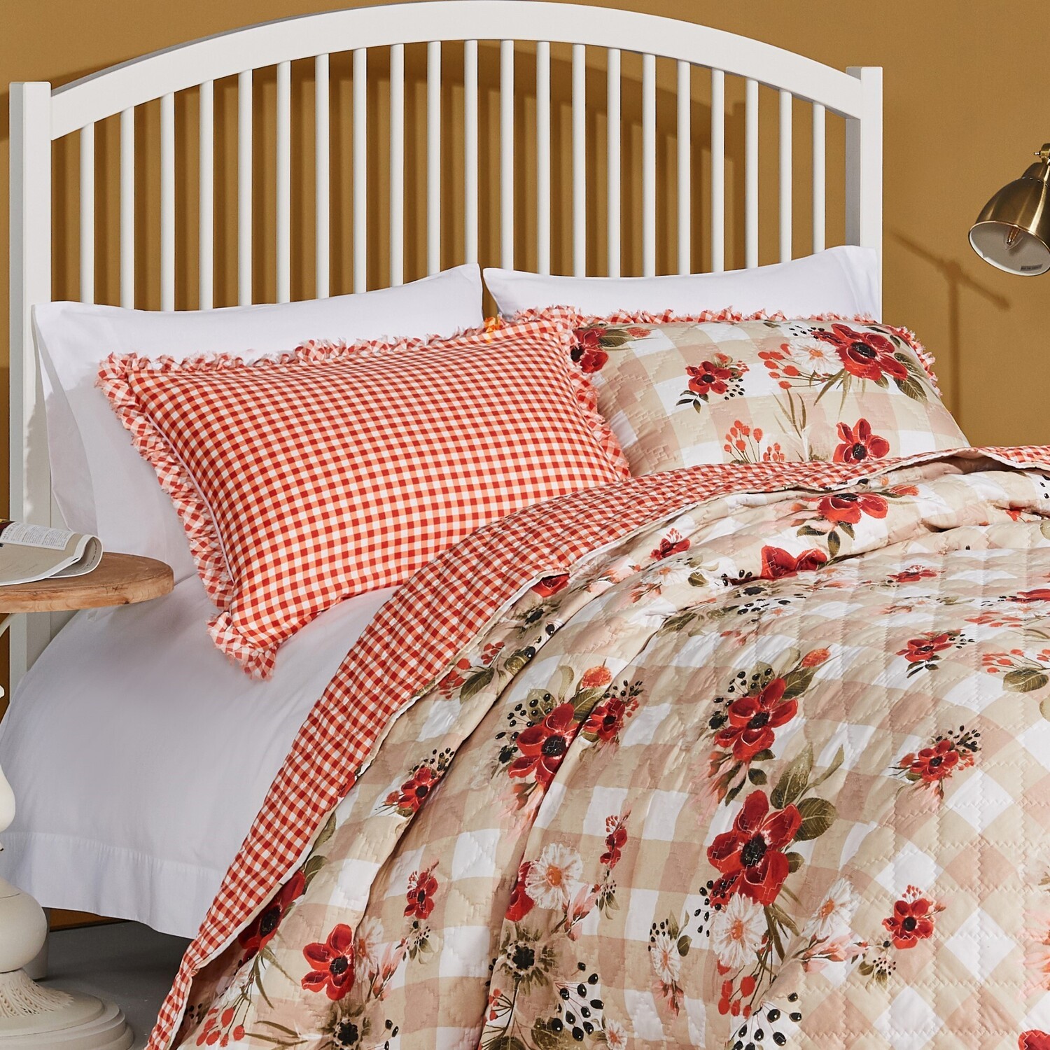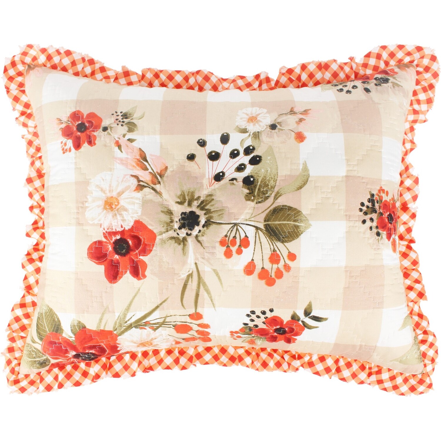 With country farmhouse style, the Wheatly collection from Greenland Home Fashions looks great in any home. Red and white windflowers billow in a gentle breeze on a traditional gingham check ground. A frayed edge ruffled border in ginger and red gingham completes the look. Reverses to an all-over ginger and red checkered fabric. Includes one pillow sham. Zipper along the side of each sham holds your pillow in place and makes each sham truly reversible for two looks in one. Mix and match them on the top of your bed by flipping them over. Double down on the look and buy two. Dimensions: Standard sham measures 20x26"es; King sham measures 20x36"es (all dimensions +/- 1"). Machine Wash. Imported. Machine washable. 100% Brushed microfiber face and back; polyester fill. Imported.ShamDimensions: Standard sham 20x26"es; King sham 20x36"es (+/- 2-inches)Double down on the look with extra pillow shams!Zipper along the side to hold your pillow in place makes these shams truly reversible so you easily change up the look of your bedPREWASHED and pre-shrunk for a soft, comfortable feel and a perfect fit right out of the packageMachine washable.