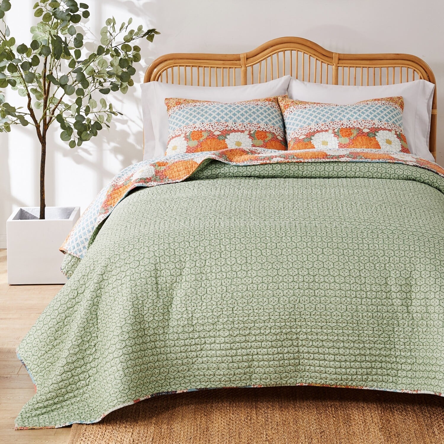 Brighten your bedroom with the fresh, updated colors of this striped print bedding by Barefoot Bungalow. An eclectic blend of dreamy calico patterns in gold, blue, orange and green creates a cheerful mood. This enchanting quilt set features bright florals and whimsical songbirds, and reverses to an all over coordinating geometric print in green. Vermicelli quilting throughout adds texture and surface interest. Reversible pillow sham(s) complete the look. Oversized for better coverage on today’s deeper mattresses. Prewashed with extra softener for a silky feel and preshrunk for size resilience with fabric bound edges. Quilt set comes with quilt and two pillow shams (one sham per Twin set). Dimensions: Twin set comes with 68x88-inch quilted coverlet, plus one 20x26-inch quilted pillow sham. Full/Queen set comes with one 90x90-inch quilted coverlet, plus two 20x26-inch quilted pillow shams. King set comes with one 105x95-inch quilted coverlet, plus two 20x36-inch quilted pillow shams. All dimensions +/- 2”. 100% Cotton face; 100% microfiber polyester back; Cotton-rich fill is 60% cotton/40% polyester. Machine Wash. Imported.Quilt SetWHAT'S INCLUDED: Each set comes with quilt plus two pillow shams (one sham with twin set)DIMENSIONS: Twin/XL set includes one 68x88-inch quilt plus one 20x26-inch pillow sham, Full/Queen set includes one 90x90-inch quilt plus two 20x26-inch pillow shams, King/Cal King set includes one 105x95-inch quilt plus two 20x36-inch pillow shams (all diSAFETY TESTED and certified by OEKO-TEX® Standard 100: WSI Certificate # 20.HCN.11993. Tested to be free of 350+ harmful chemicals and substances – keeping you and your loved ones safe from these threats with our products.NATURAL COMFORT: 100% cotton fabrics are prized for their natural comfort. Cotton is a breathable and soft material that provides a cozy and inviting sleep environment.Machine washable.