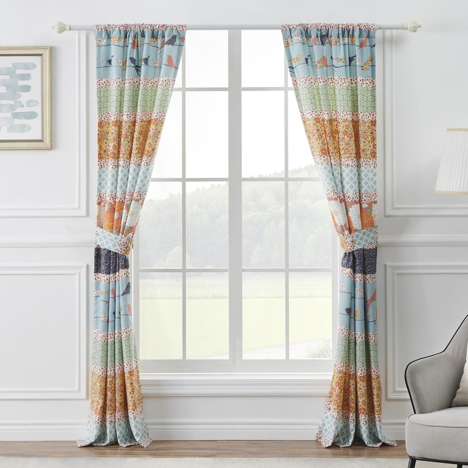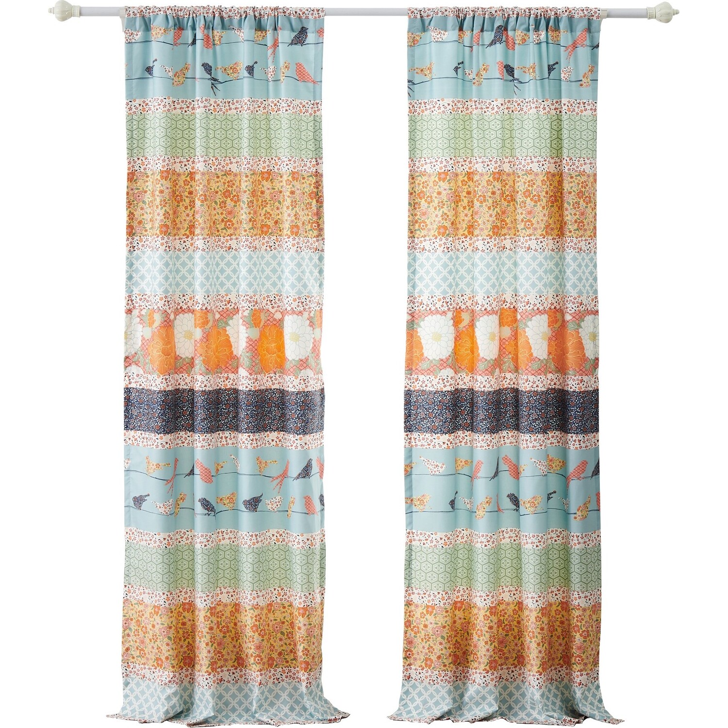 Brighten your scene with the fresh, updated colors of these striped print curtain panels by Barefoot Bungalow. An eclectic blend of dreamy calico patterns in gold, blue, orange and green creates a cheerful mood. This striped print features bright florals and whimsical songbirds. Lined with solid color fabric for increased privacy and sun protection, each 4-Piece curtain panel set includes two panels and two tie backs. Dimensions: Each panel measures 84"es long x 42"es wide (x2) for total coverage area of 84 x 84"es. 100% polyester face, back (2 ply). Three-inch wide rod pocket along the top fits most curtain rods for hanging. Machine wash. Imported.WindowLined for increased sun protectionEach set features two panels and two tie backs.Rod pocket measures three"es wide and fits most curtain rods for hanging.Machine washable