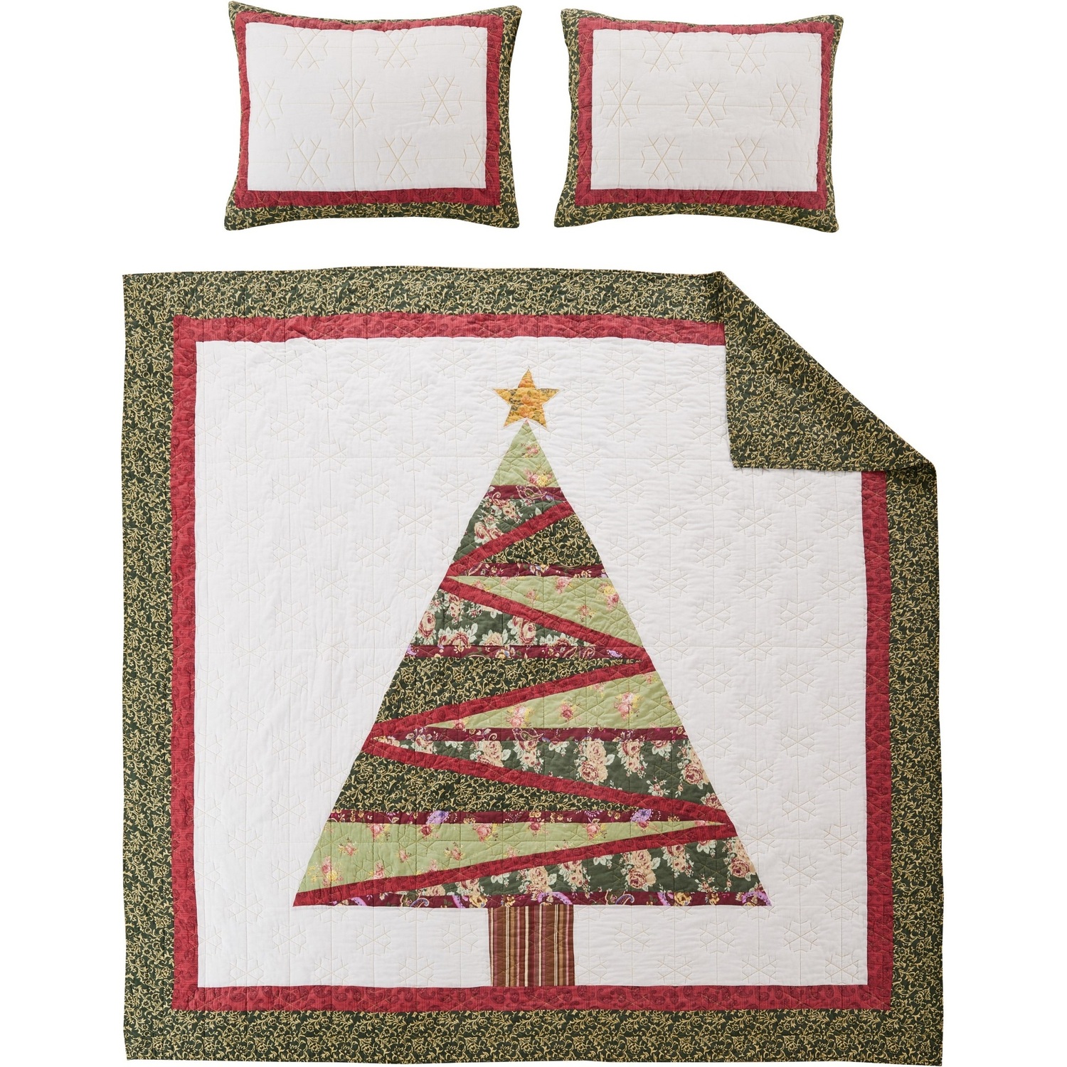 Ring in the spirit of the holidays with the Christmas Tree quilt set by Greenland Home Fashions. Each heirloom-quality quilt is carefully assembled in patchwork and applique using fashion print fabrics in festive colors to evoke the mood of the holidays and the peaceful stillness of a winter wonderland. Manufactured from natual cotton, each set features a snowflake quilting pattern. 100% cotton face and back with cotton-rich fill. Quilt SetWHAT'S INCLUDED: Each set comes with quilt plus two pillow shams (one sham with twin set).DIMENSIONS: Twin set includes one 68x88-inch quilt plus one 20x26-inch pillow sham, Full/Queen set includes one 90x90-inch quilt plus two 20x26-inch pillow shams, King set includes one 105x95-inch quilt plus two 20x36-inch pillow shams (all dimensions +/OVERSIZED for better coverage on today's deeper mattressesAUTHENTIC PATCHWORK CONSTRUCTION assembled from fastive fabric panels meticulously sewn together with applique embellishmentsMachine washable