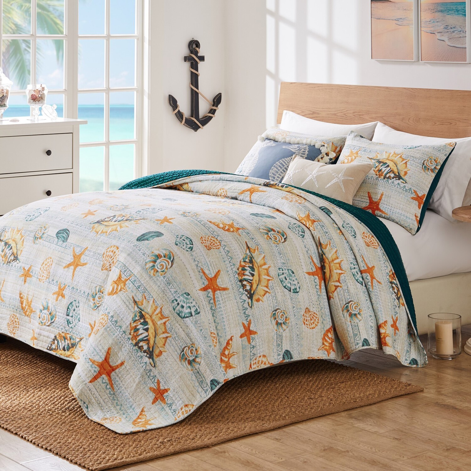 Dive into tranquility with our all-new Kona Quilt Set, a seascape for your bedroom. Immerse yourself in the calming hues of speckled blues and earth-tone stripes, reminiscent of a sun-kissed sandy beach. Adorned with intricately printed seashells, this quilt set is a coastal dream come true. Crafted for your comfort, with a sumptuous cotton face, velvety brushed microfiber back, and plush cotton-rich fill, Kona creates a haven of softness and style. Complete with matching shams, this set is an invitation to unwind in coastal elegance. Quilt SetWHAT'S INCLUDED: Each set comes with quilt plus two pillow shams (one sham with twin set)DIMENSIONS: Twin/XL set includes one 68x88-inch quilt plus one 20x26-inch pillow sham, Full/Queen set includes one 90x90-inch quilt plus two 20x26-inch pillow shams, King/Cal King set includes one 105x95-inch quilt plus two 20x36-inch pillow shams (all diSAFETY TESTED and certified by OEKO-TEX® Standard 100: WSI Certificate # 20.HCN.11993. Tested to be free of 350+ harmful chemicals and substances – keeping you and your loved ones safe from these threats with our products.NATURAL COMFORT: 100% cotton fabrics are prized for their natural comfort. Cotton is a breathable and soft material that provides a cozy and inviting sleep environment.Machine washable