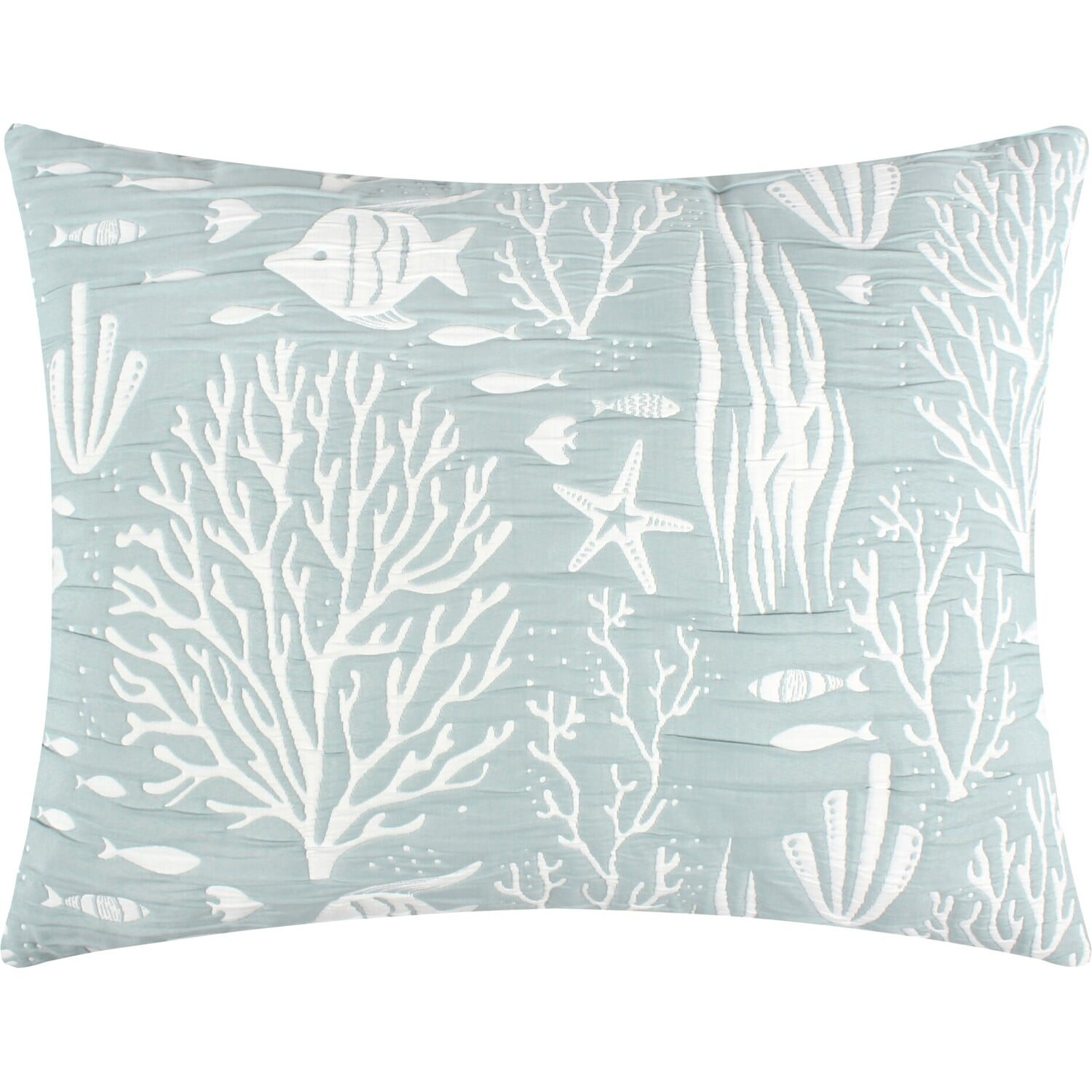 Introducing our Marina woven jacquard collection – an underwater masterpiece of coastal elegance. Immerse yourself in the intricate world of living fan corals, sea stars, and tropical fish gracefully woven into the fabric. The reversible design offers versatility, with a face adorned in serene Seafoam icons on a crisp, white ground and a reverse featuring white marine icons bathed in calming blue surroundings. Dive into a sea of comfort with the meticulously crafted jacquard woven pillow shams. Marina transforms your space into a coastal haven – where every night is a voyage beneath the waves.ShamDimensions: Standard sham 20x26"es; King sham 20x36"es (+/- 2-inches)Zipper along the side to hold your pillow in place makes these shams truly reversible so you easily change up the look of your bedSAFETY TESTED and certified by OEKO-TEX® Standard 100: WSI Certificate # 20.HCN.11993. Tested to be free of 350+ harmful chemicals and substances – keeping you and your loved ones safe from these threats with our products.PREWASHED and pre-shrunk for a soft, comfortable feel and a perfect fit right out of the packageMachine washable