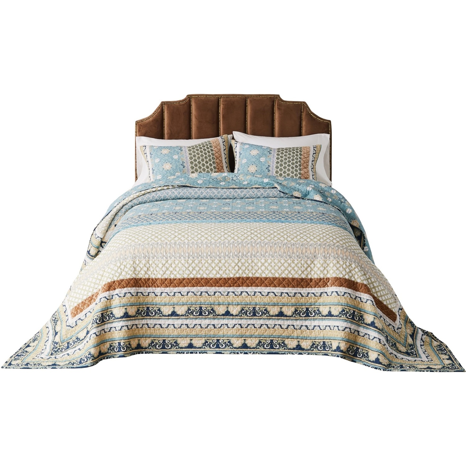 Rows of vivid medallions, stylized florals and geometric prints create distinctive bohemian styling. The Thalia floor-length bedspread set features mitered borders and multi-fabric construction embellished with velvet bands. Reverses to a coordinating updated floral print on a Slate blue ground. Each set comes with floor-length bedspread and two pillow shams. The Queen set comes with two standard pillow shams and the King set comes with two King-sized pillow shams. Pillow shams feature envelope opening on reverse with cloth ties you can use to hold your pillow in place. Dimensions: Queen set includes one 110x118-inch bedspread and two 20x26-inch pillow shams; King set includes one 120x118-inch bedspread and two 20x36-inch pillow shams. All dimensions +/- 2"es. Face 95% cotton with 5% polyester velvet embellishment; back 100% cotton; fill 60% cotton, 40% polyester. Prewashed for extra softness.Bedspread SetCOTTON face, back and fillWHAT'S INCLUDED: Each set comes with one bedspread and two pillow shams.DIMENSIONS: Queen set includes one 110x118-inch bedspread and two 20x26-inch pillow shams; King set includes one 120x118-inch bedspread and two 20x36-inch pillow shamsPREWASHED and pre-shrunk for a soft, comfortable feel and a perfect fit right out of the packageMachine washable