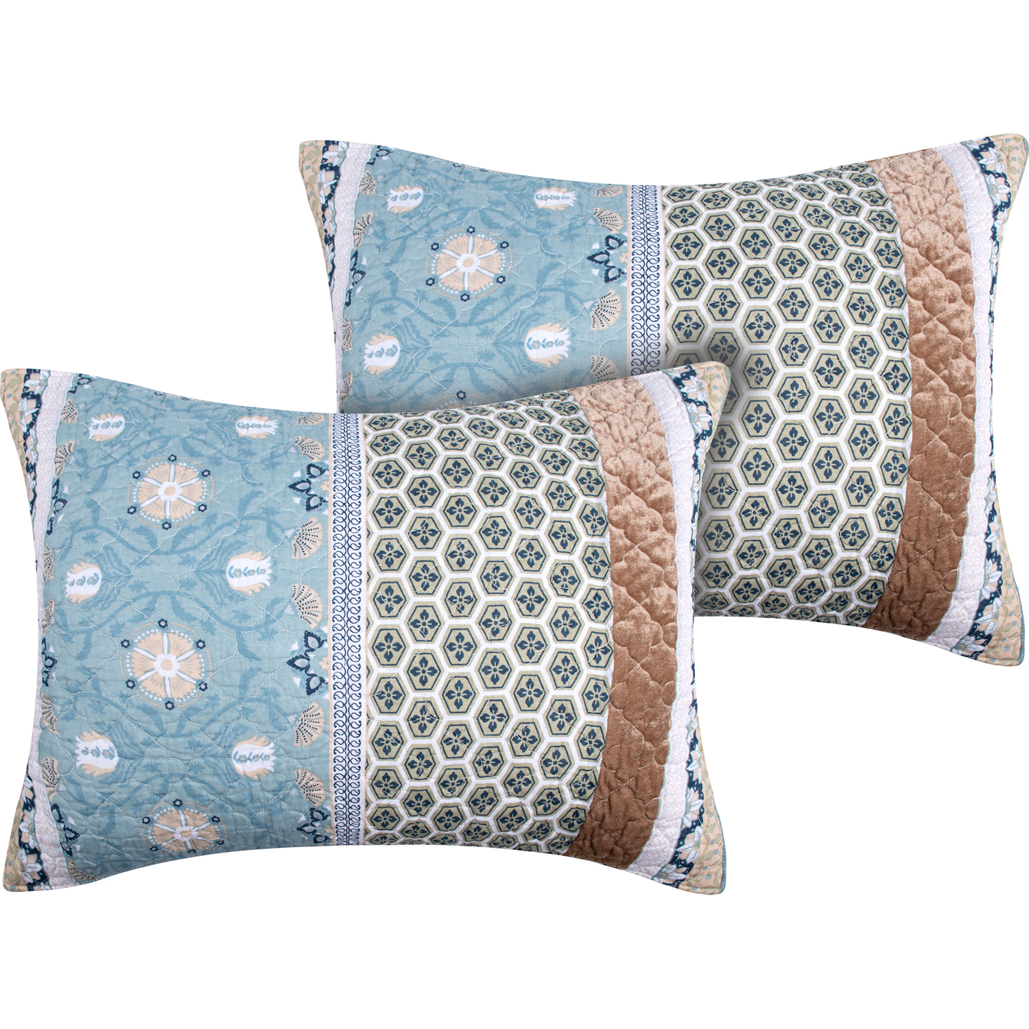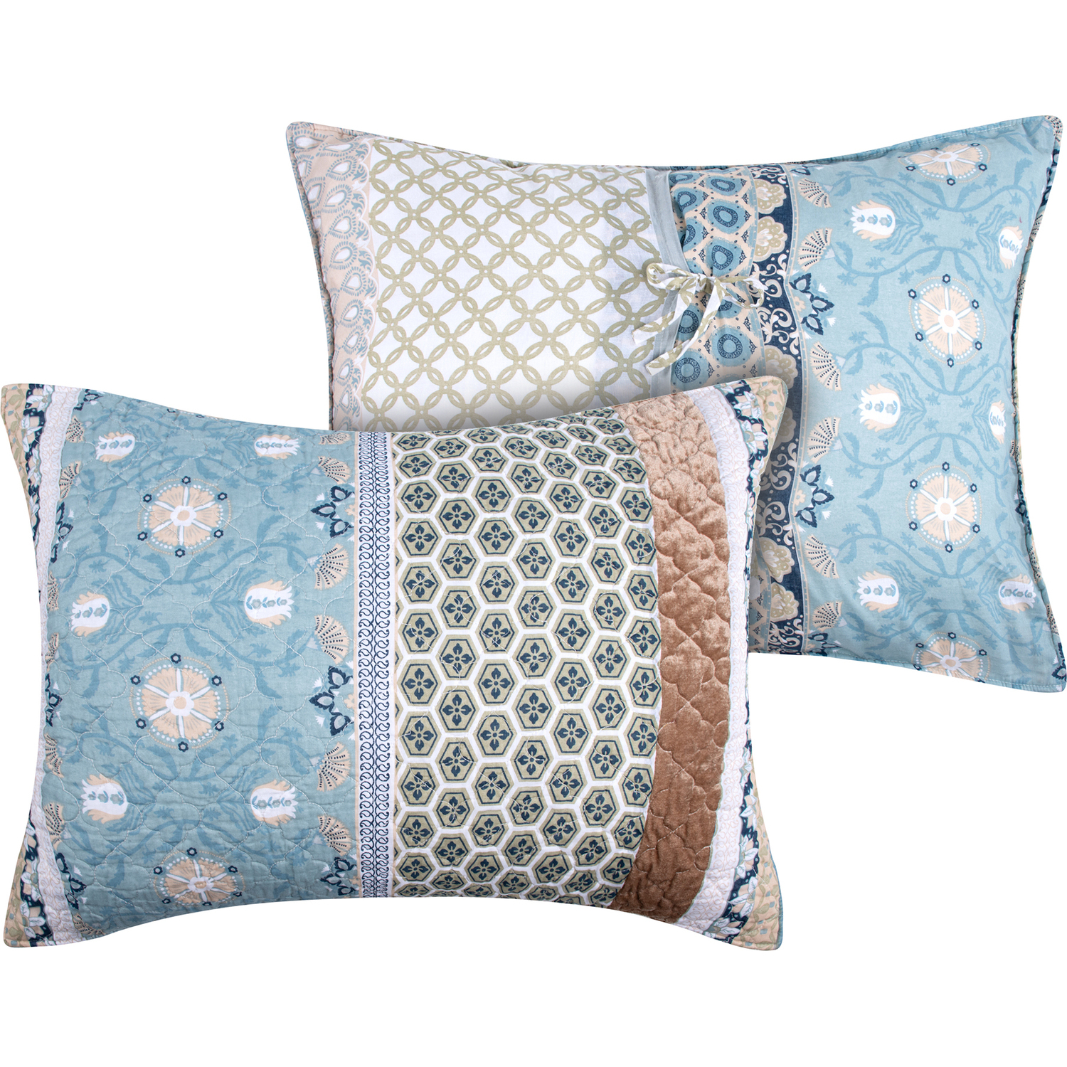 Rows of vivid medallions, stylized florals and geometric prints create distinctive bohemian styling. The Thalia quilted sham features multi-fabric construction embellished with velvet bands. Reverses to a coordinating floral print on a Slate blue ground. Face 95% cotton with 5% polyester velvet embellishment; back and fill 100% cotton. Machine quilted with fabric bound edges for durability and surface interest. Dimensions: Standard sham 20x26”, King sham 20x36”. Dimensions +/- 2”. Machine Wash.ShamFeaturing cloth ties and center envelope opening on reverseMachine quilted for durability and surface interestPrewashed and preshrunkPREWASHED and pre-shrunk for a soft, comfortable feel and a perfect fit right out of the packageMachine washable