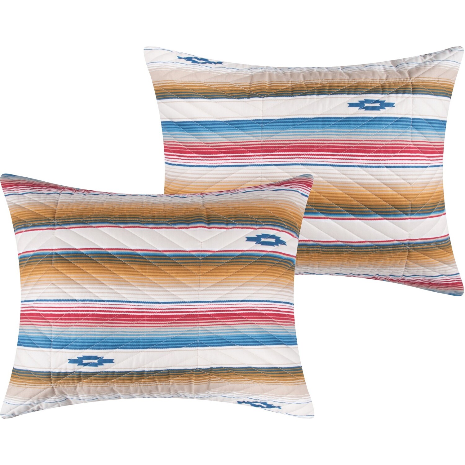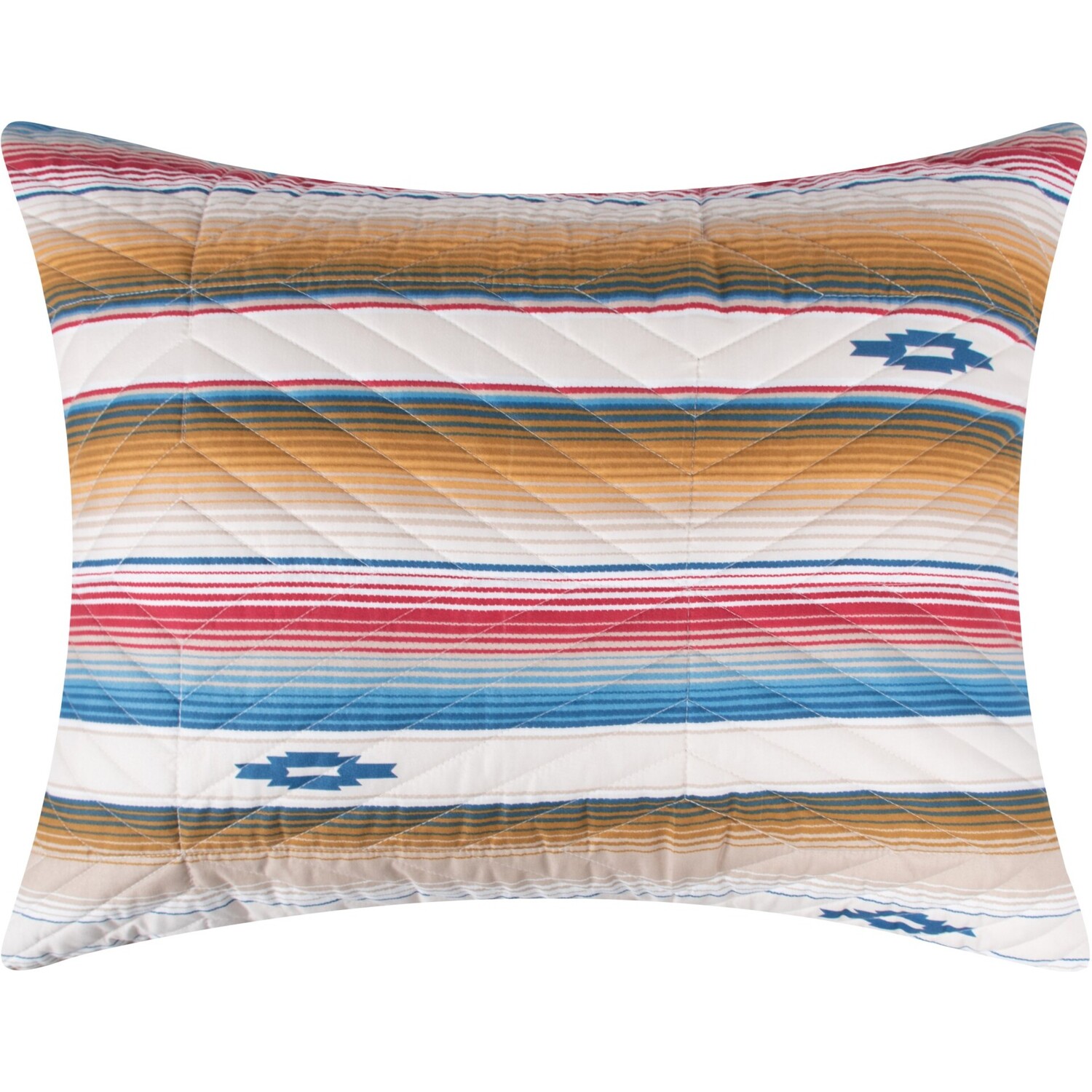 Bring home Southwestern styling at its most refined! Sapphire blue and red stripes set against a honey gold and ivory ground are embellished with thunderbird motifs and geometric chevron quilting. Painted Desert offers the simple sophistication of Southwest style to transform your space with rustic flair. Reverses to a complimentary geometric print is sapphire blue. Decorative quilting enhances the durability of each piece. Prewashed with extra softener for unparalleled comfort. Machine quilted with fabric bound edges for durability and surface interest. ShamWHAT'S INCLUDED: One quilted pillow sham featuring zipper side closure for your pillowDIMENSIONS: Standard sham measures 20"es x 26"es; King sham measures 20"es x 36"es (+/- 1")SAFETY TESTED and certified by OEKO-TEX® Standard 100: WSI Certificate # 20.HCN.11993. Tested to be free of 350+ harmful chemicals and substances – keeping you and your loved ones safe from these threats with our products.DOUBLE DOWN on the look with extra pillow shamsMachine washable