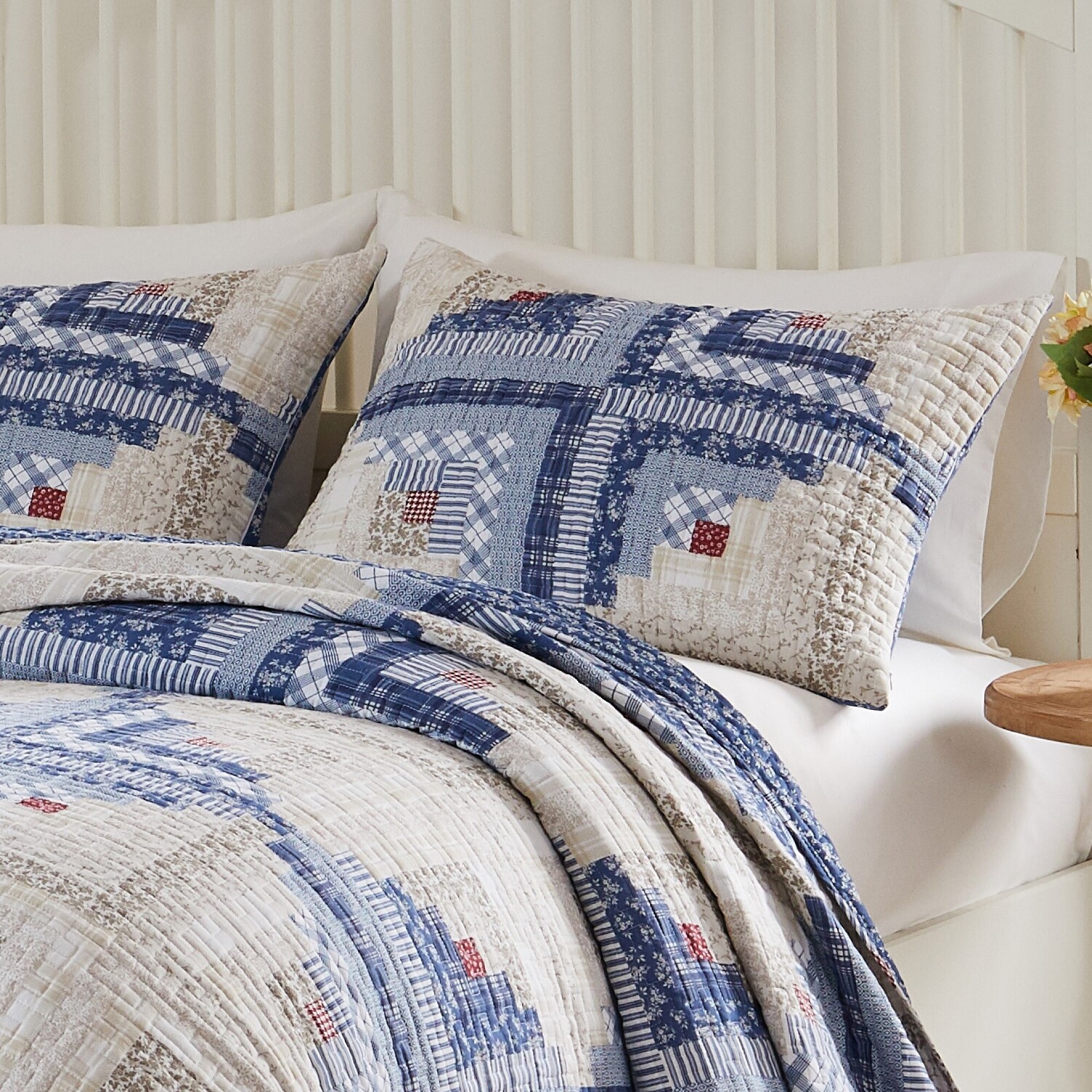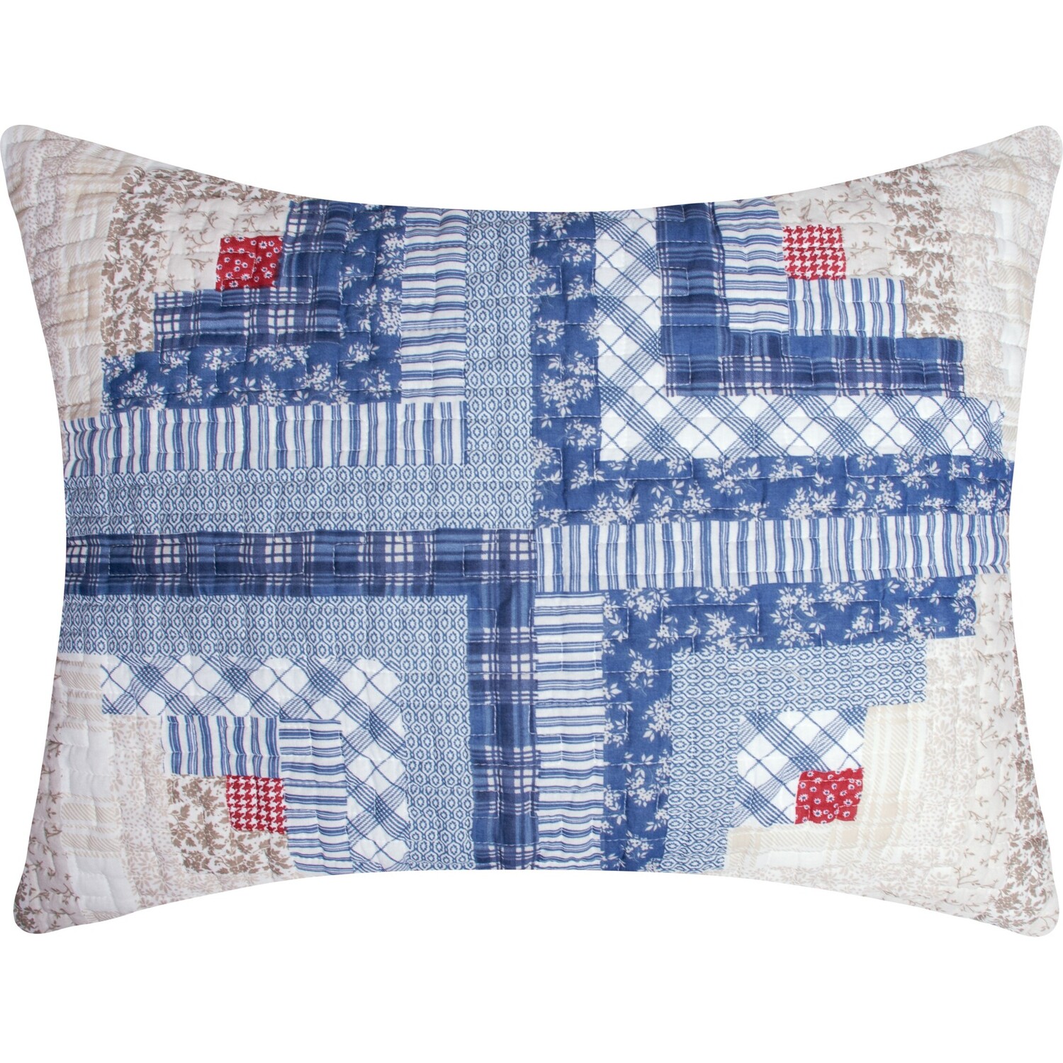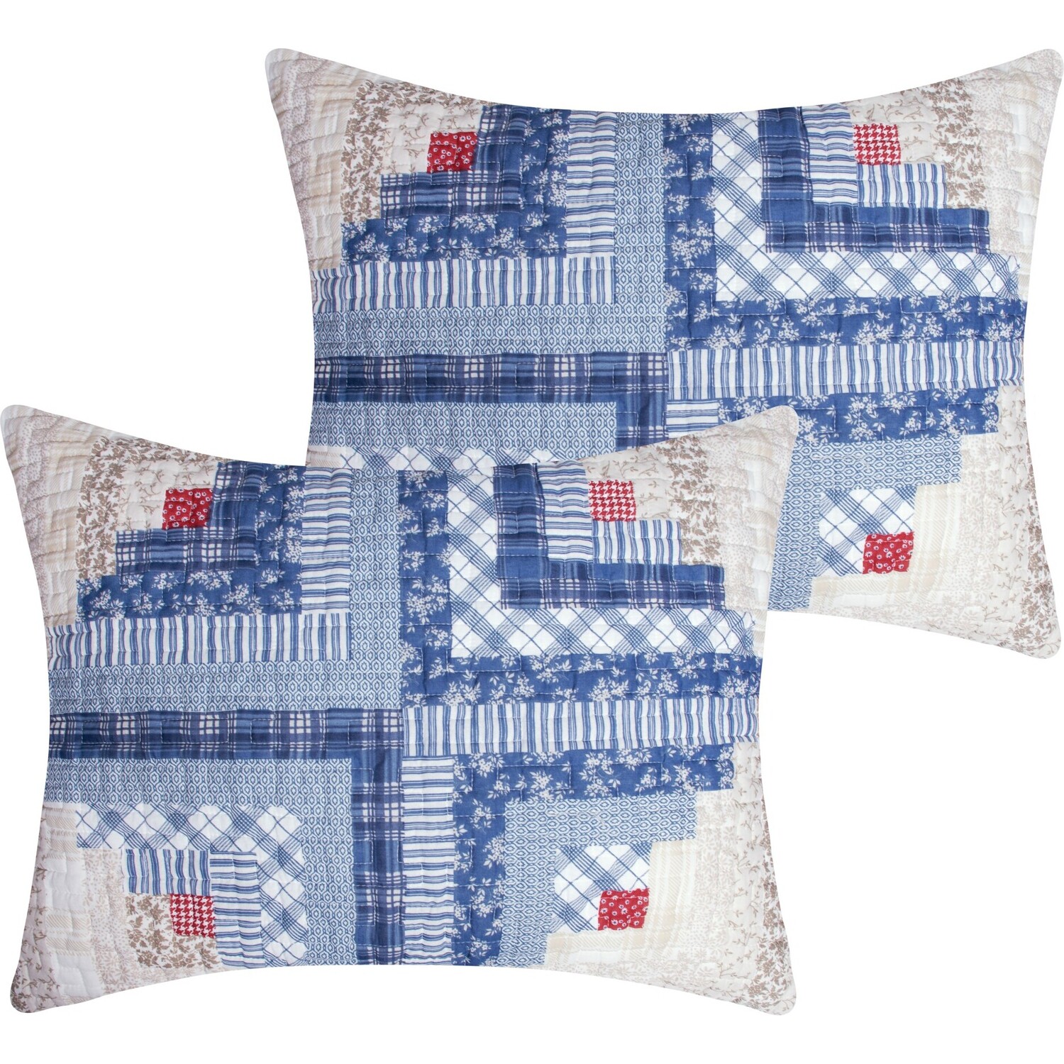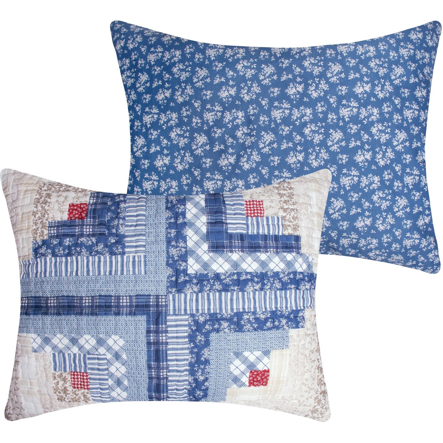 Embrace the timeless allure of our charming "Cottage Cabin" pillow sham, a cozy pillow cover for your bedroom sanctuary. Perfect for those seeking quality, and comfort, each quilted pillow sham features a premium cotton face, plush microfiber back, and soft polyester fill for a dreamy night's sleep or a nap on the couch. Traditional log cabin motifs, with hues of blue, ivory, and chestnut, accented by pops of vibrant red, add warmth and character to your space. The reversible design features a side zipper and a blue calico ditsy floral print on the back. Double down on the look and buy two. Cottage Cabin, a truly versatile sham you will cherish for years to come.ShamWHAT'S INCLUDED: One quilted pillow sham featuring zipper side closure for your pillowDIMENSIONS: Standard sham measures 20"es x 26"es; King sham measures 20"es x 36"es (+/- 1")SAFETY TESTED and certified by OEKO-TEX® Standard 100: WSI Certificate # 20.HCN.11993. Tested to be free of 350+ harmful chemicals and substances – keeping you and your loved ones safe from these threats with our products.DOUBLE DOWN on the look with extra pillow shamsMachine washable