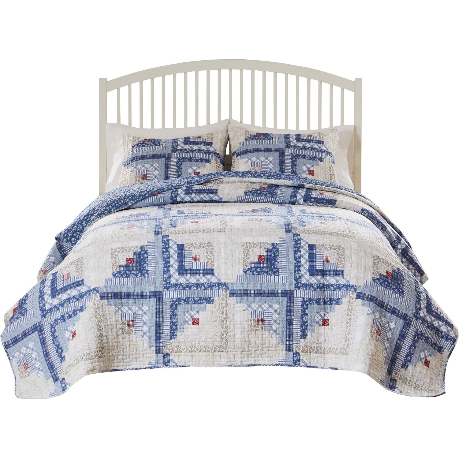 Embrace the timeless allure of our charming "Cottage Cabin" quilt set, a cozy retreat for your bedroom sanctuary. Perfect for those seeking quality, comfortable bedding, this quilt set features a premium cotton face, plush microfiber back, and soft polyester fill for a dreamy night's sleep. Traditional log cabin motifs, with hues of blue, ivory, and chestnut, accented by pops of vibrant red, add warmth and character to your space. Complete with two matching pillow shams (one sham in Twin size), this quilt set effortlessly elevates your bedroom decor with rustic elegance. The reversible design, featuring a blue calico ditsy floral print on the back of both quilt and pillow sham(s), allows you to change up the look on your bed for a truly versatile ensemble you will cherish for years to come.Quilt SetWHAT'S INCLUDED: Each set comes with quilt plus two pillow shams (one sham with twin set)DIMENSIONS: Twin/XL set includes one 68x88-inch quilt plus one 20x26-inch pillow sham, Full/Queen set includes one 90x90-inch quilt plus two 20x26-inch pillow shams, King/Cal King set includes one 105x95-inch quilt plus two 20x36-inch pillow shams (all diSAFETY TESTED and certified by OEKO-TEX® Standard 100: WSI Certificate # 20.HCN.11993. Tested to be free of 350+ harmful chemicals and substances – keeping you and your loved ones safe from these threats with our products.NATURAL COMFORT: 100% cotton fabrics are prized for their natural comfort. Cotton is a breathable and soft material that provides a cozy and inviting sleep environment.Machine washable