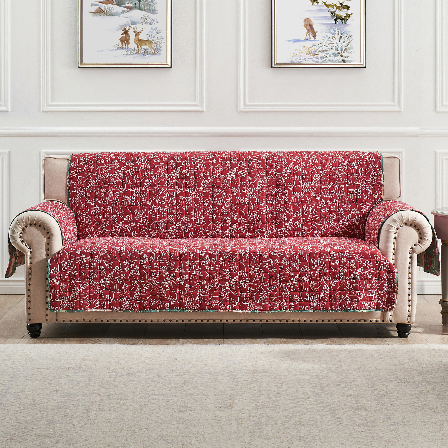 Protect your furniture from spills, pet hair, paws, wear and tear with these generously sized furniture covers. Bring whimsical holiday spirit into your home with the Willow furniture protector. Featuring festive red, green, and natural forest colors, this quilt showcases friendly owls, foxes, hedgehogs, and songbirds, with charming details like Santa hats on the owl and fox. The reverse side displays a budding willow print in red and white, adding a delightful touch of the forest to your holiday decor. Mix and match reversible furniture covers for variety and convenience. Big enough to provide ample coverage on most home furniture. Reversible protector is printed on one side with a complimentary print on the other for two looks in one. The elastic strap holds protector in place on your furniture. Overall dimensions: Armchair Protector 81x81"es; Loveseat Protector 103x76"es; Sofa Protector 127"es x 77"es; all dimensions +/- 2"es.Furniture ProtectorSLIP PROOF Features removable elastic strap on back to hold the protector in place on furniture. REVERSIBLE protector features complimentary prints on both sides for two looks in one. GENEROUSLY SIZED to provide ample coverage on most home furniture. PET FRIENDLY Keeps your pets from direct contact with your furniture upholsteryMachine washable