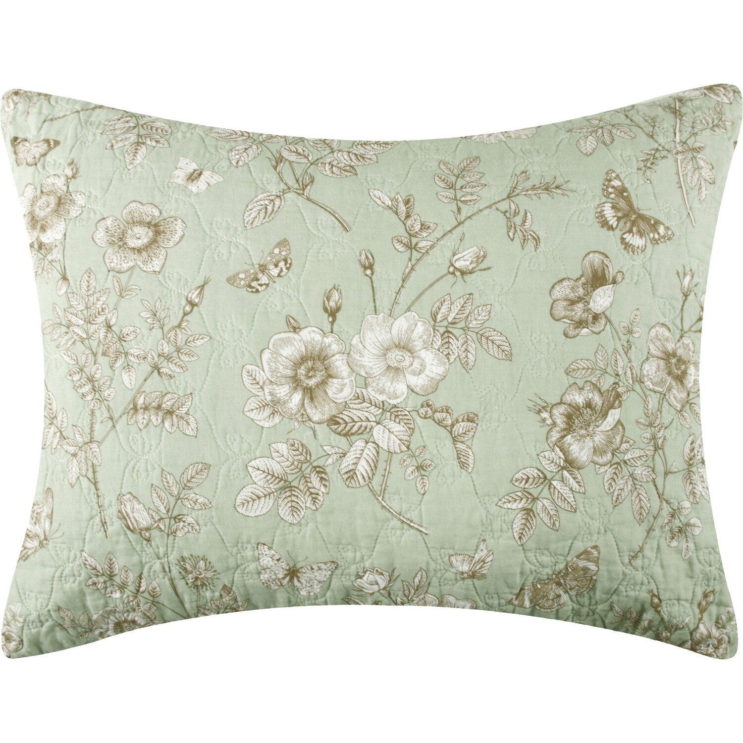 Complete your bedroom's look with the Olivia Quilted Pillow Sham, a beautiful accent for your nature-inspired lifestyle. Featuring an elegant floral and butterfly print in mint green, antique bronze, and white, this pillow sham adds a graceful touch to your décor. The reverse side showcases the same botanical design in olive green and white, offering two styling options. Hidden side zipper holds your pillow in place and makes each sham truly reversible. Expertly crafted with 100% cotton on the face and soft, brushed microfiber on the reverse, this pillow sham combines comfort with sophisticated design. The delicate butterfly quilting pattern adds texture and charm to any bed or seating area. Available in standard and king sizes, it features an envelope closure for easy use. Whether used as a decorative accent or paired with the Olivia Quilt Set, this pillow sham brings timeless beauty and a natural elegance to your space.ShamPREWASHED and pre-shrunk for a soft, comfortable feel right out of the packageDIMENSIONS: Standard sham measures 20"es x 26"es; King sham measures 20"es x 36"es (+/- 1")SAFETY TESTED and certified by OEKO-TEX® Standard 100. Tested to be free of 1000+ harmful chemicals and substances – keeping you and your loved ones safe from these threats with our products.WHAT'S INCLUDED: One quilted pillow sham with side zipper to hold your pillow in placeEASY CARE Machine Washable