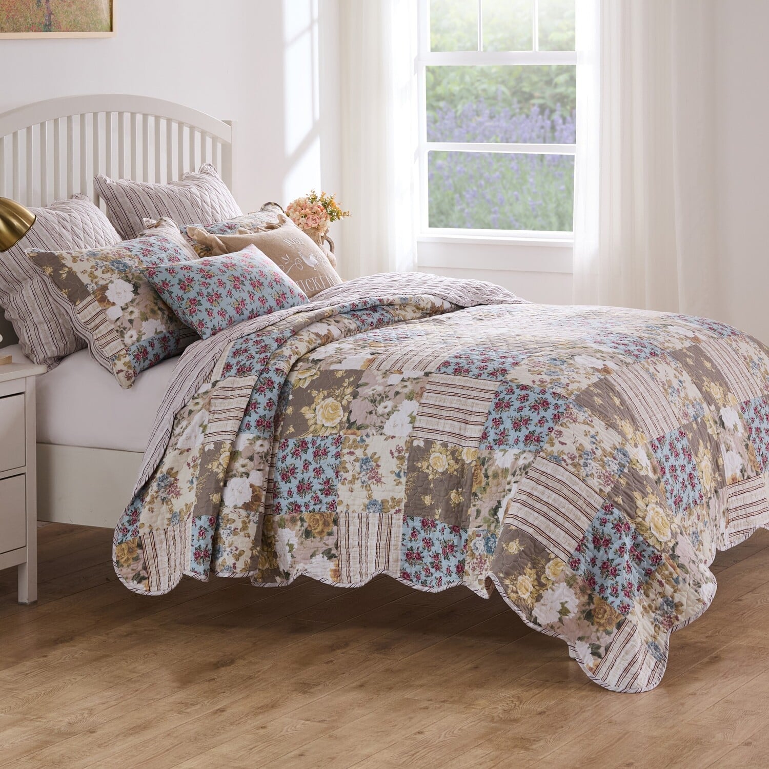 Transform your bedroom into a cozy countryside retreat with the French Country quilt set. French Country showcases timeless florals, vintage-inspired stripes, and classic motifs in a harmonious palette of soft blues, warm browns, and gentle yellows. Flip it over to reveal a reversible ticking stripe pattern, offering two versatile looks in one. Perfect for adding a touch of rustic elegance to any bedroom, this set includes matching quilted pillow shams for a polished, coordinated look. Faux patchwork pattern is actually printed on whole cloth, ensuring lightweight comfort without sacrificing the look of hand-sewn craftsmanship. Whether you’re decorating a cottage, farmhouse, or modern home with vintage vibes, French Country offers you an effortless way to bring beauty and comfort to your space.Quilt SetPREWASHED and pre-shrunk for a soft, comfortable feel and a perfect fit right out of the packageWHAT'S INCLUDED: One quilt and one standard pillow shamDIMENSIONS: Twin/XL set includes 68 W x 88 L quilt and 20 W x 26 L pillow sham (inches +/- 2)OVERSIZED for better coverage on today's deeper mattressesEASY CARE Machine Washable