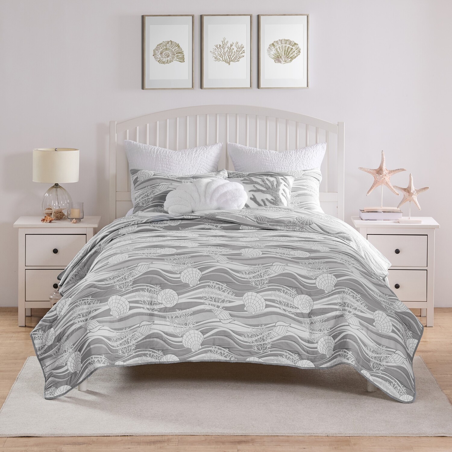 Introducing Dover, our newest matelassé coverlet set – a masterpiece of coastal elegance. Immerse yourself in gentle ocean waves, corals, and seashells gracefully woven into the fabric. The reversible design offers versatility, with a face adorned in white marine icons on a soft gray ground and a reverse featuring gray icons bathed in calming alabaster white. Dive into a sea of comfort with this meticulously crafted coverlet set. Dover transforms your space into a coastal haven – where every night is a voyage beneath the waves. Perfect for your seaside bungalow or nautical themed home. Comes complete with reversible pillow shams (1 sham with Twin set).Coverlet SetWHAT'S INCLUDED: Each set comes with coverlet plus two pillow shams (one sham with twin set)DIMENSIONS: Twin/XL set includes one 68x88-inch coverlet plus one 20x26-inch pillow sham, Full/Queen set includes one 90x90-inch coverlet plus two 20x26-inch pillow shams, King/Cal King set includes one 105x95-inch coverlet plus two 20x36-inch pillow shamSAFETY TESTED and certified by OEKO-TEX® Standard 100: WSI Certificate # 20.HCN.11993. Tested to be free of 350+ harmful chemicals and substances – keeping you and your loved ones safe from these threats with our products.REVERSIBLE VERSATILITY: Change up the look of your bed with these reversible jacquard wovent coverlet setsEASY CARE Machine Washable