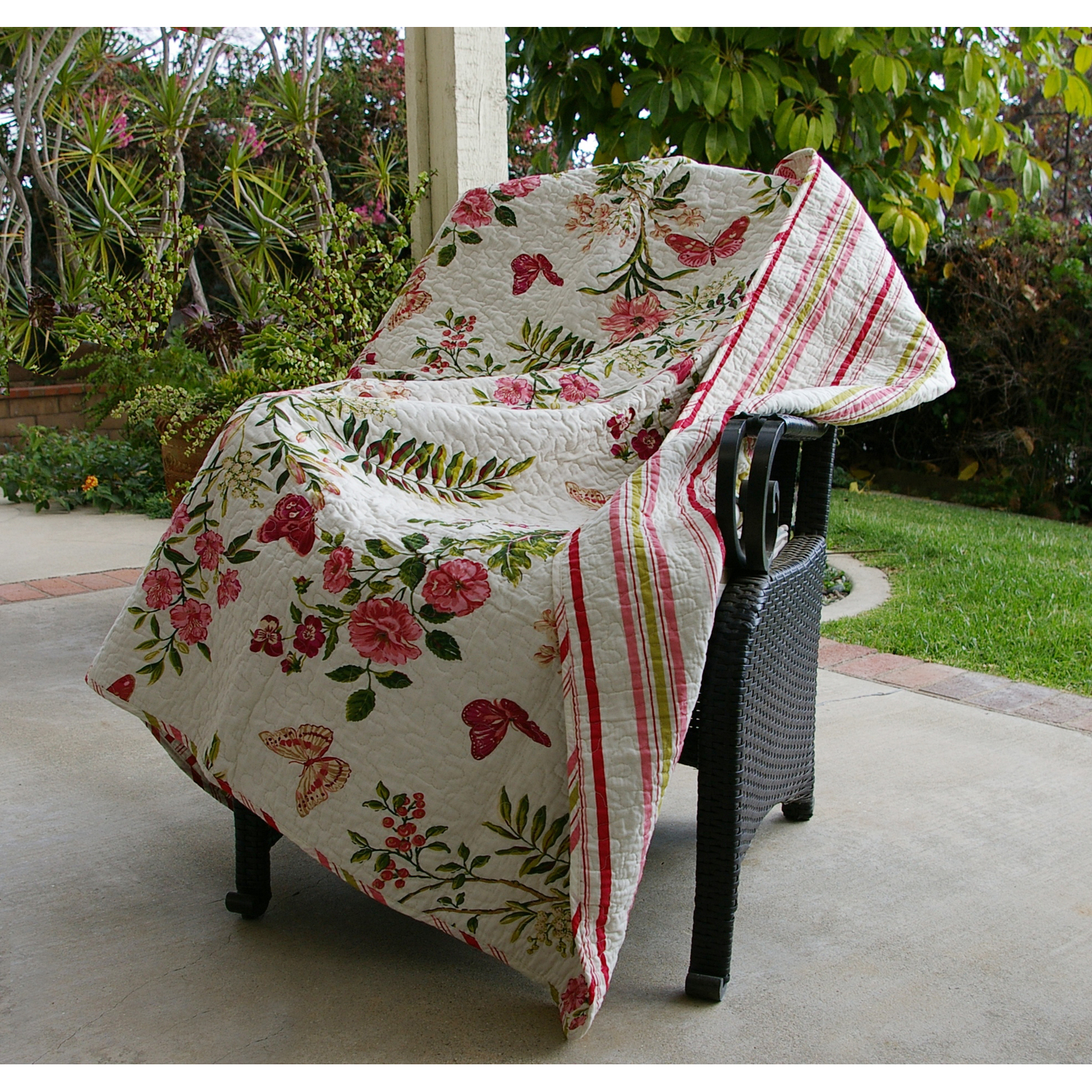 Bring the great outdoors into your bedroom with the Butterflies quilt style! Intricate vermicelli quilting provides a rich surface texture. Butterflies reverses to a coordinating fashion stripe for two looks in one! Accessory100% COTTON face, back and fill - prewashed for extreme comfortVERSATILE LAYERING PIECE: Use as a throw blanket for your couch or as a layering piece on top of your bed. Also makes a great tapestry for your wall.SAFETY TESTED and certified by OEKO-TEX® Standard 100: Tested to be free of 1000+ harmful chemicals and substances – keeping you and your loved ones safe from these threats with our products.NATURAL COMFORT: 100% cotton is prized for natural comfort. Cotton is a breathable and soft material that provides a cozy and inviting sleep environment.Machine washable
