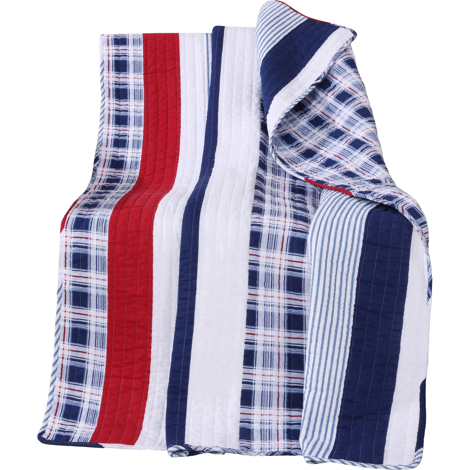 Patriotic and fashionable, this beautiful red, white and blue Nautical Stripe gives any bed a timeless look. Rows of stripes, solids and plaid in channel stitching provides textures and durability. Reverses to an all-over coordinating plaid for a two look in one! ? Machine quilted for durability. Prewashed and preshrunk. All cotton face, back and fill. Care instructions: Machine wash. Dimensions: About 50x60”.Accessory100% Cotton face, back and fillWHAT'S INCLUDED: One quilted throwSAFETY TESTED and certified by OEKO-TEX® Standard 100: WSI Certificate # 20.HCN.11993. Tested to be free of 350+ harmful chemicals and substances – keeping you and your loved ones safe from these threats with our products.NAUTICAL GLORY Featuring red, white and blue colors for a patriotic look and feelMachine washable