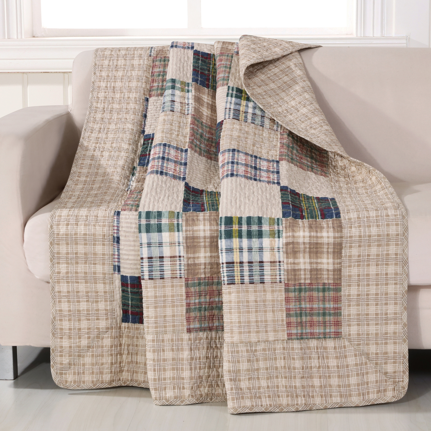 The Oxford quilted throw, with a variety of colorful plaid squares, bordered within a coordinating ground, reverses to an all-over neutral plaid. This quilt compliments a variety of colors popular in the home or dorm. Machine quilted for durability. Prewashed and preshrunk. All cotton face, back and fill. Care instructions: Machine wash. Dimensions: About 50x60"es.Accessory100% COTTON face, back and fill - prewashed for extreme comfortVERSATILE LAYERING PIECE: Use as a throw blanket for your couch or as a layering piece on top of your bed. Also makes a great tapestry for your wall.SAFETY TESTED and certified by OEKO-TEX® Standard 100: Tested to be free of 1000+ harmful chemicals and substances – keeping you and your loved ones safe from these threats with our products.NATURAL COMFORT: 100% cotton is prized for natural comfort. Cotton is a breathable and soft material that provides a cozy and inviting sleep environment.Machine washable