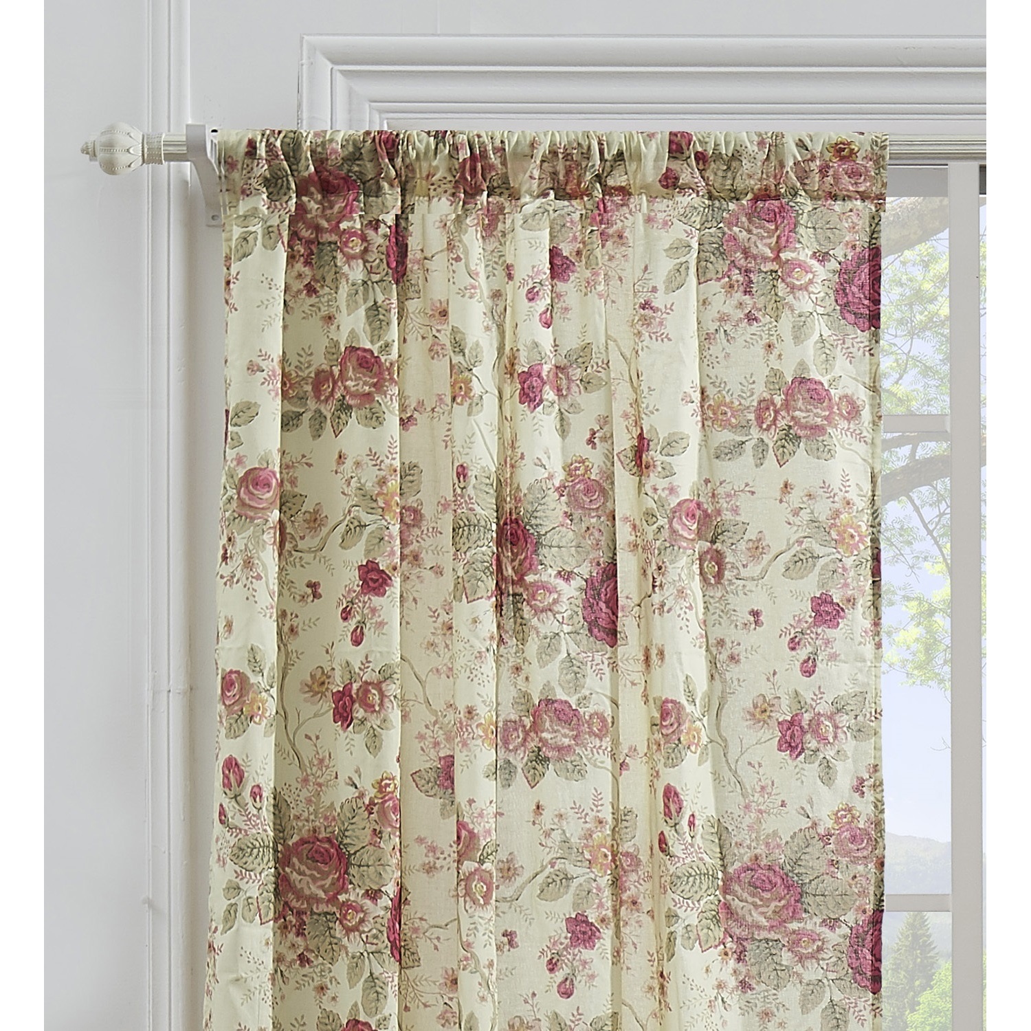 For a classic shabby chic look that will never go out of style, bring home the Antique Rose window curtain panel set. Antique Rose, by Greenland Home Fashions, combines traditional and Victorian sensibilities with renewable 100% cotton fibers. Lined with a solid color liner for increased privacy and sun protection, each light-filtering window panel set features two panels and two tie-backs. Panel dimensions: Each panel measures 42"es wide x 84"es long (x2), for a total window coverage area of 84"es x 84"es with both panels in the set. Tie-backs measure 3"es wide x 24"es long each. Valance sold separately. Rod pocket along the top is three"es wide and accommodates most curtain rod sizes for hanging. 100% Cotton with cotton liner.WindowLined for increased sun protectionEach set features two panels and two tie backs.Rod pocket measures three"es wide and fits most curtain rods for hanging.Machine washable