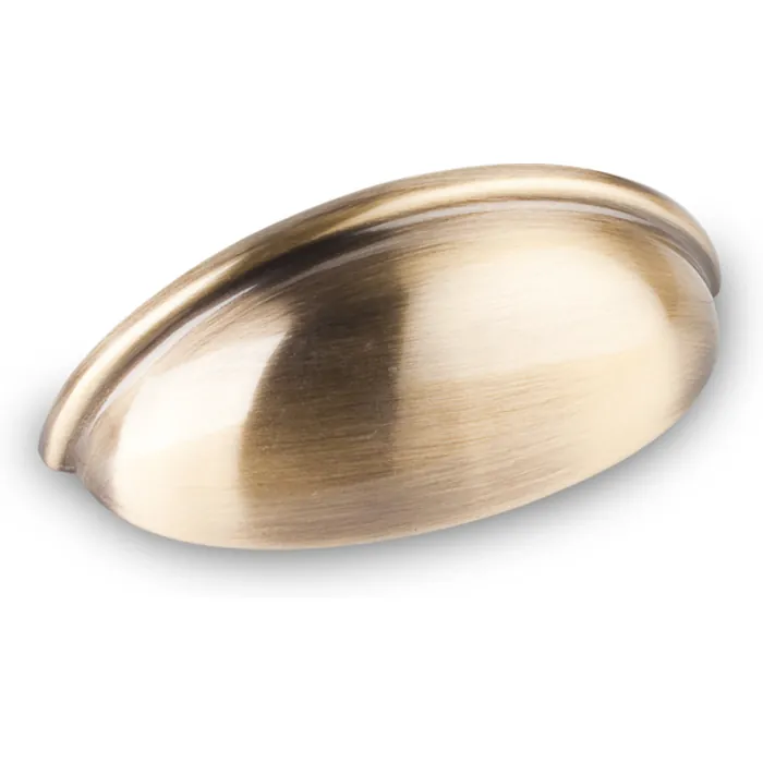 3-11/16" Overall Length Small Cup Cabinet Pull. Holes are 3" center-to-center. Packaged with two 8-32 x 1" and two Break-away screws. Finish: Brushed Antique Brass