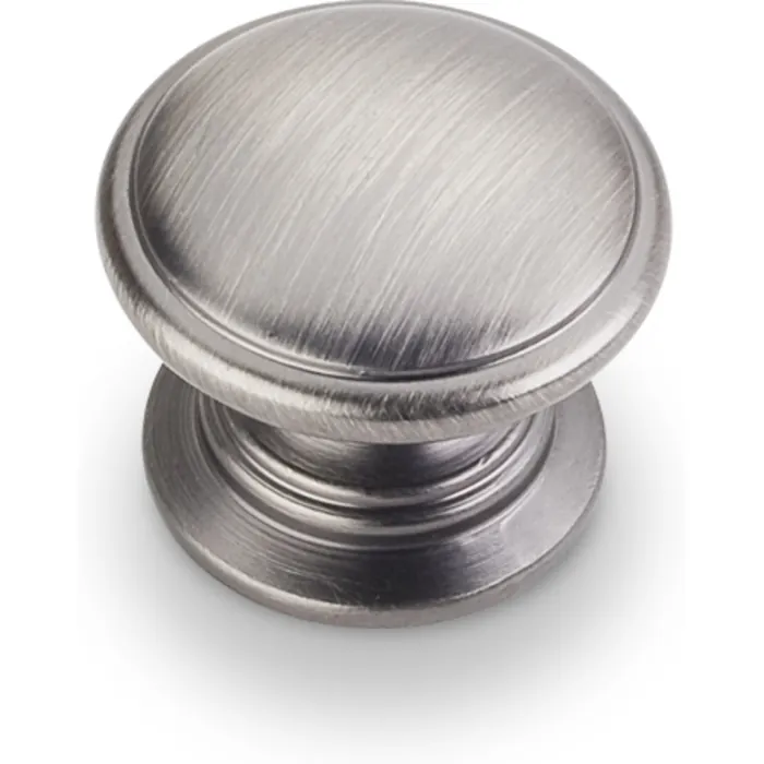 1-1/4" Diameter Cabinet Knob. Packaged with one 8-32 x 1" and 1-3/4" Break-away screw. Finish: Brushed Pewter