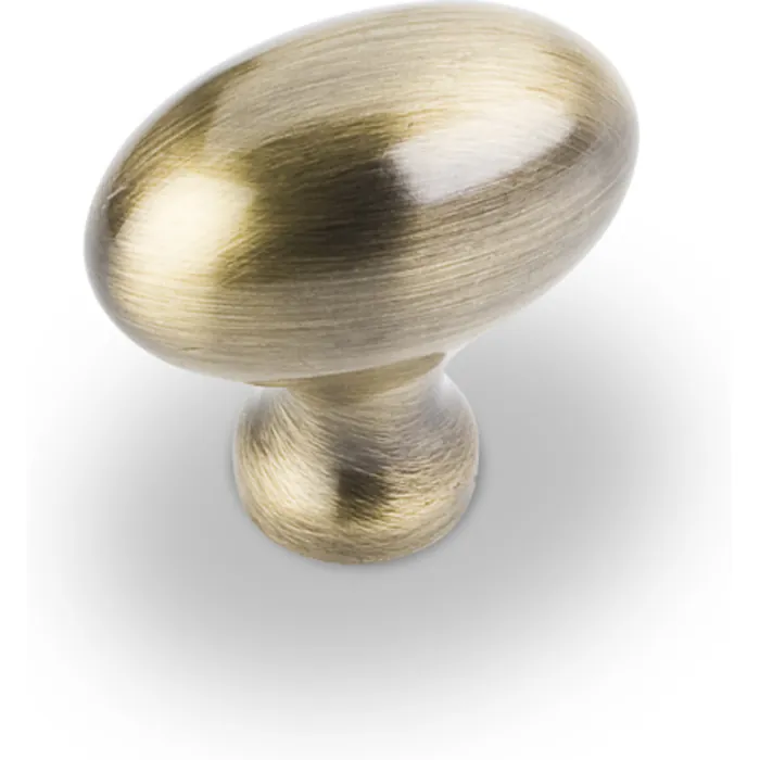 1-9/16" Overall Length Football Cabinet Knob. Packaged with one 8-32 x 1" and 1-3/4" Break-away screw. Finish: Brushed Antique Brass