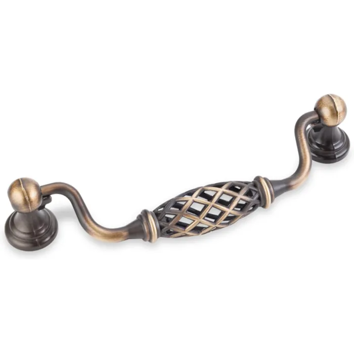 5-15/16" Overall Length Birdcage Cabinet Pull with backplates. Holes are 128 mm center-to-center. Packaged with two 8-32 x 1" screws. Finish: Antique Brushed Satin Brass