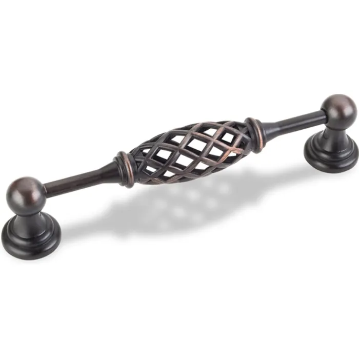5-15/16" Overall Length Birdcage Cabinet Pull. Holes are 128 mm center-to-center. Packaged with two 8-32 x 1" and two Break-away screws. Finish: Brushed Oil Rubbed Bronze