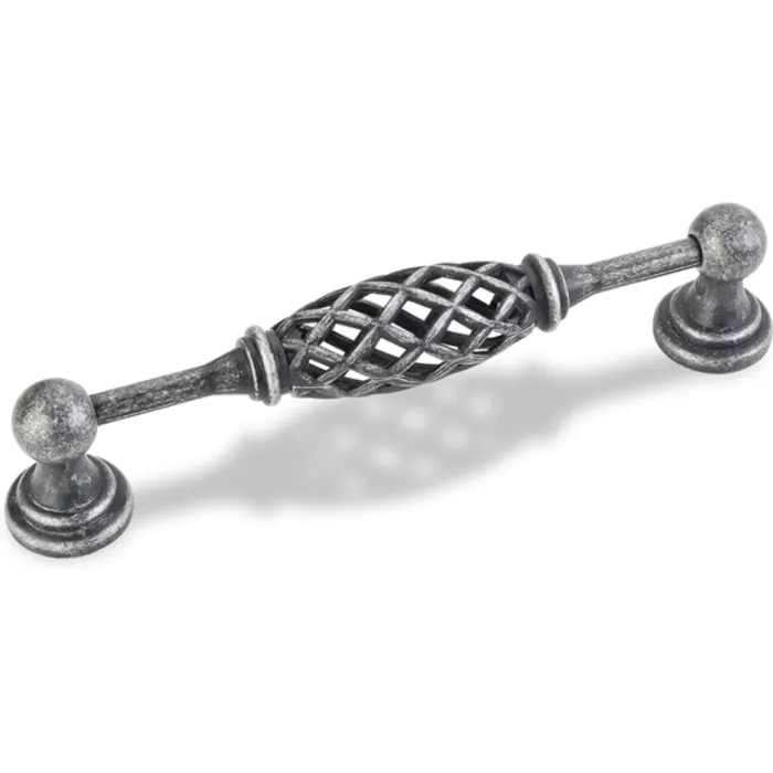 5-15/16" Overall Length Birdcage Cabinet Pull. Holes are 128 mm center-to-center. Packaged with two 8-32 x 1" and two Break-away screws. Finish: Distressed Antique Silver