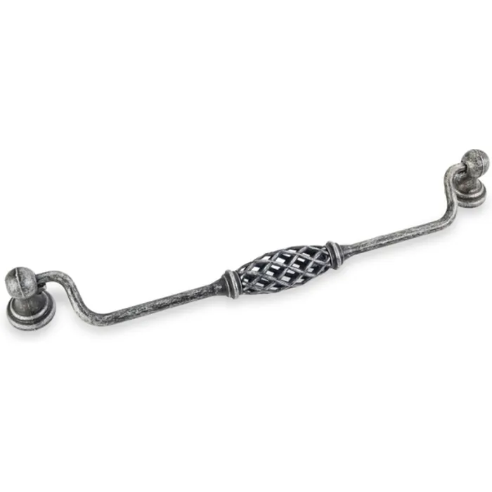9-3/4" Overall Length Birdcage Cabinet Pull with backplates. Holes are 224 mm center-to-center. Packaged with two 8-32 x 1" screws. Finish: Distressed Antique Silver