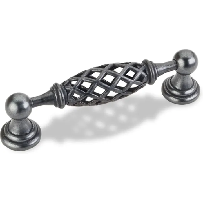 4-11/16" Overall Length Birdcage Cabinet Pull. Holes are 96 mm center-to-center. Packaged with two 8-32 x 1" screws. Finish: Gun Metal
