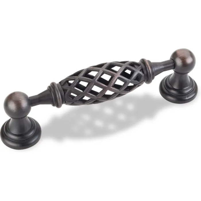 4-11/16" Overall Length Birdcage Cabinet Pull. Holes are 96 mm center-to-center. Packaged with two 8-32 x 1" and two Break-away screws. Finish: Brushed Oil Rubbed Bronze