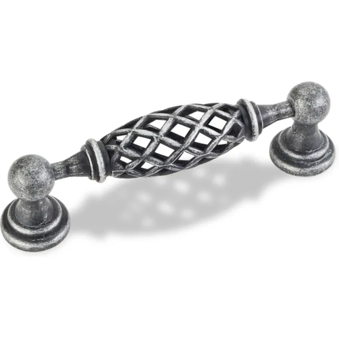 4-11/16" Overall Length Birdcage Cabinet Pull. Holes are 96 mm center-to-center. Packaged with two 8-32 x 1" and two Break-away screws. Finish: Distressed Antique Silver