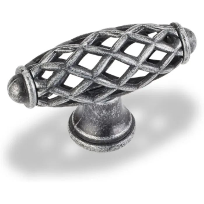 2-5/16" Overall Length Bird Cage Cabinet Knob. Packaged with one 8-32 x 1" and 1-3/4" Break-away screw. Finish: Distressed Antique Silver
