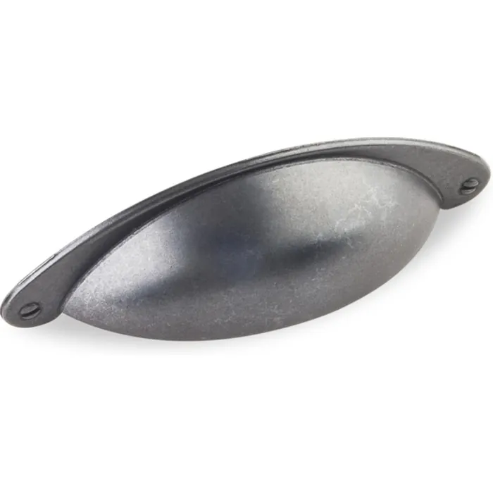 4-15/16" Overall Length Shaker Cabinet Cup Pull. Holes are 3" center-to-center. Packaged with two 8-32 x 1" and two Break-away screws. Finish: Gun Metal