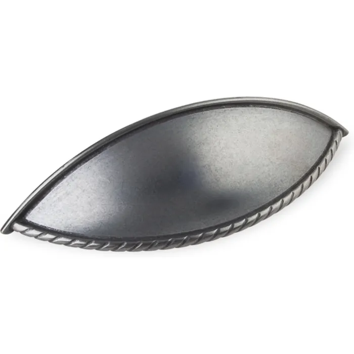 5" Overall Length Shaker Cabinet Cup Pull with Rope Detail. Holes are 96 mm center-to-center. Packaged with two 8-32 x 1" and two Break-away screws. Finish: Gun Metal