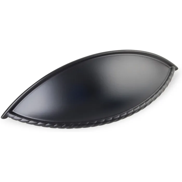 5" Overall Length Shaker Cabinet Cup Pull with Rope Detail. Holes are 96 mm center-to-center. Packaged with two 8-32 x 1" and two Break-away screws. Finish: Matte Black
