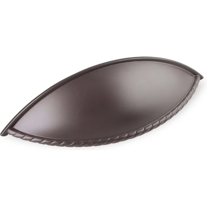5" Overall Length Shaker Cabinet Cup Pull with Rope Detail. Holes are 96 mm center-to-center. Packaged with two 8-32 x 1" and two Break-away screws. Finish: Dark Bronze