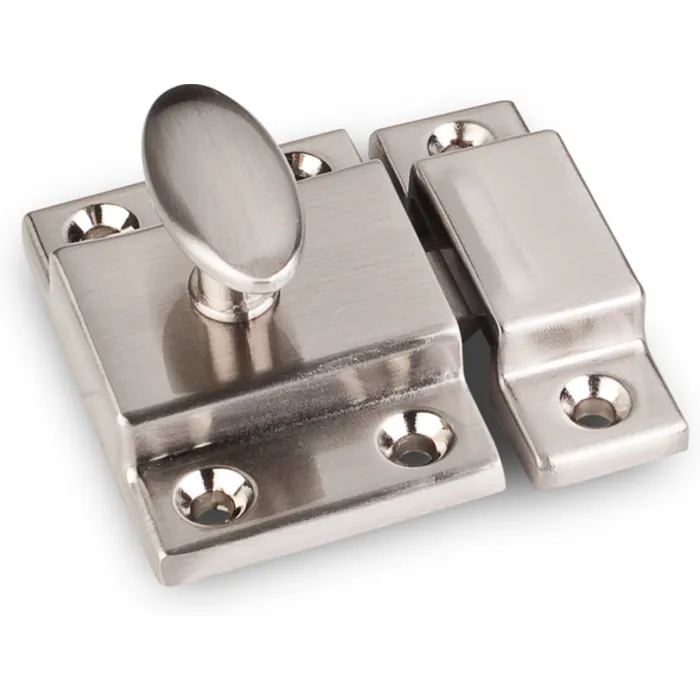 1-3/4" x 1-3/4" Overall Length Two Piece Spring Loaded Cupboard Latch. Packaged with Six #5 x 5/8" Phillips screws. Finish: Satin Nickel