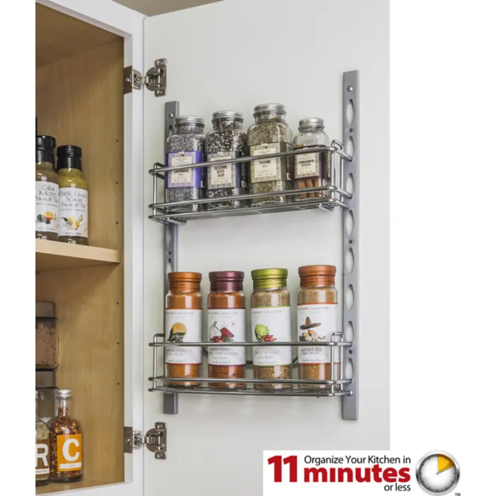 Door Mount Tray Systemfor Cabinet and Pantry Doors .Organizes Cans, Jars and Packets.Kit Includes 2 pcs of Track 18-1/8" Long and 2 Trays that are 11" x 3" x3-7/16".Retail Packaged.Finish: Chrome