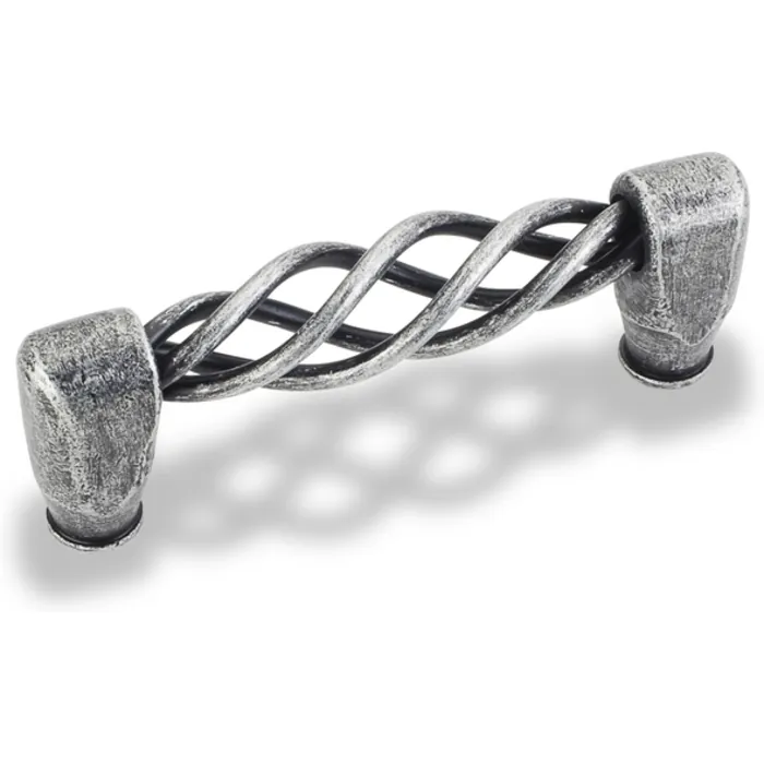 3-9/16" Overall Length Twisted Iron Cabinet Pull. Holes are 3" center-to-center. Packaged with two 8-32 x 1" and two Break-away screws. Finish: Distressed Antique Silver