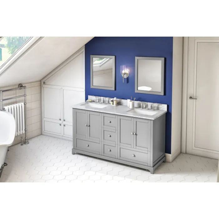 - Vanity Kit: 60" double Grey Addington Vanity (VN2ADD-60-GR-NT), 61" White Carrara Marble top (TOPR61WC), 2 rectangle bowls (VN2-RECT-19)