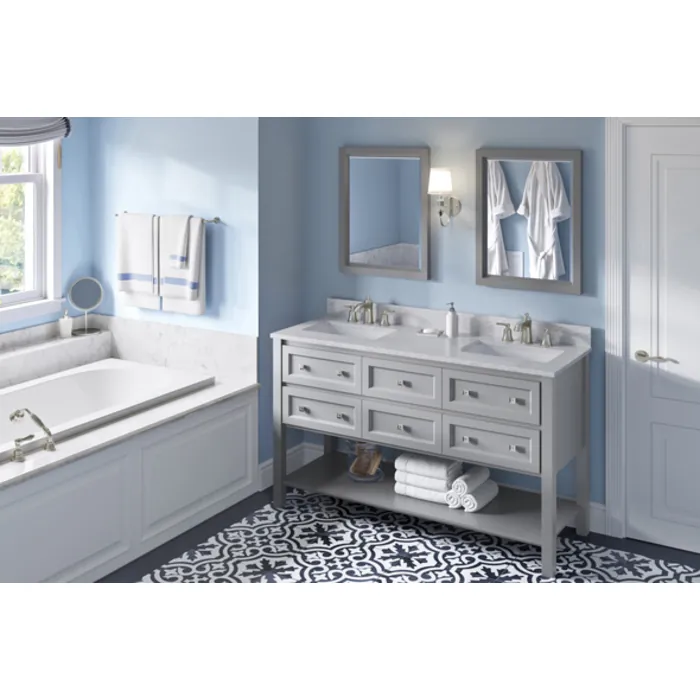 Sleek square legs, an open bottom shelf, and the classic Shaker design create a perfect blend of style and function. This vanity includes two full cabinets, two soft-close full-extension center drawers, and an open bottom shelf to accentuate the bath with storage solutions. The Grey Adler vanity is adorned with Satin Nickel knobs from Jeffrey Alexander's Modena collection. Vanity measurements: 60" W x 21-1/2" D x 35" H. This 61" White Carrara Marble vanity top is designed to fit 60" double bowl vanities. White Carrara Marble is a timeless natural stone that creates a neutral clean space. Dark grey veining undulates throughout the stone as it weaves its way across the surface. The two cutouts are sized to fit our undermount rectangle vanity bowls. Above each cutout are 3 holes that are cut for an 8” widespread faucet. A 4” tall backsplash is included. This vanity top is designed to overhang ½" on each side and in front of the vanity. Top measurements: 61" W x 22" D x 25 mm H. Backsplash dimensions: 61" W x 25 mm D x 4" H.
