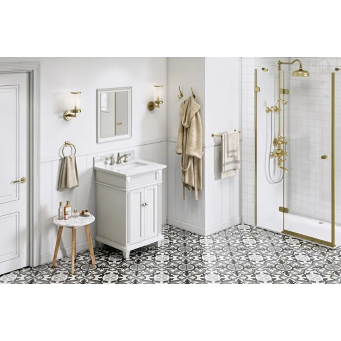 Smooth lines with faceted accents, tapered feet, and classic edging create a versatile style. Place a Douglas vanity in a modern space or in a traditional room for the transformation you're looking for. This unit features an adjustable shelf in the cabinet. This White vanity is adorned with Jeffrey Alexander's Roman knobs in Satin Nickel. Vanity measurements: 24" W x 21-1/2" D x 35" H. This 25" White Carrara Marble vanity top is designed to fit 24" center bowl vanities. White Carrara Marble is a timeless natural stone that creates a neutral clean space. Dark grey veining undulates throughout the stone as it weaves its way across the surface. The center rectangle cutout is sized to fit our undermount rectangle vanity bowl. Three holes are cut for an 8" widespread faucet, and a 4" tall backsplash is included. This vanity top is designed to overhang ½" on each side and in front of the vanity. Top measurements: 25" W x 22" D x 25 mm H. Backsplash dimensions: 25" W x 25 mm D x 4" H.