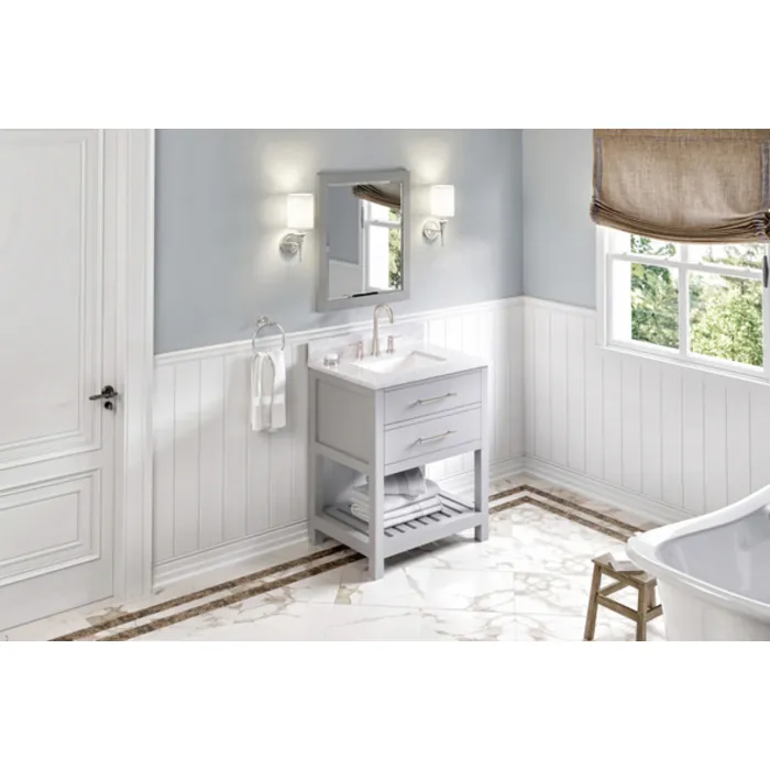 Escape to the seaside with the Wavecrest vanity collection. Crisp, clean edges and a slatted bottom shelf evoke a feeling of stepping out into the calm of the seaside. The top drawer front is transformed into hidden tipout storage space with a solid hardwood, custom-sized tipout tray. Beneath the tipout storage is a solid hardwood dovetail drawer with full-extension concealed soft-close undermount slides. This Grey vanity is adorned with Jeffrey Alexander Key West pulls in Satin Nickel. Vanity measurements: 30" W x 21-1/2" D x 35" H. This 31" White Carrara Marble vanity top is designed to fit 30" vanities. White Carrara Marble is a timeless natural stone that creates a neutral clean space. Dark grey veining undulates throughout the stone as it weaves its way across the surface. The center rectangle cutout is sized to fit our undermount rectangle vanity bowl. Three holes are cut for an 8" widespread faucet, and a 4" tall backsplash is included. This vanity top is designed to overhang ½" on each side and in front of the vanity. Top measurements: 31" W x 22" D x 25 mm H. Backsplash dimensions: 31" W x 25 mm D x 4" H.