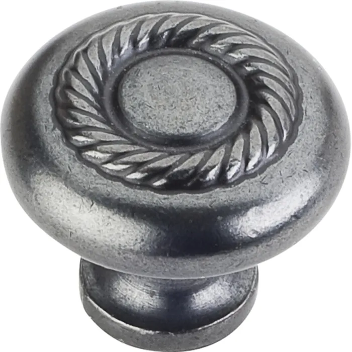 1-1/4" Diameter Cabinet Knob with Rope Detail. Packaged with one 8-32 x 1" and 1-3/4" Break-away screw. Finish: Gun Metal