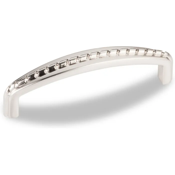 4-1/8" Overall Length Cabinet Pull with Rope Detail. Holes are 96 mm center-to-center. Packaged with two 8-32 x 1" and two Break-away screws. Finish: Satin Nickel