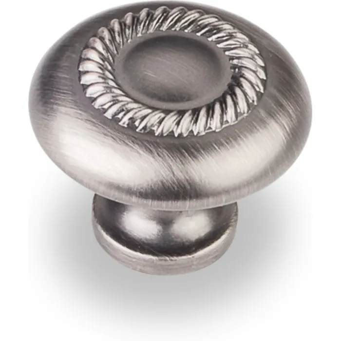 1-1/4" Diameter Cabinet Knob with Rope Detail. Packaged with one 8-32 x 1" and 1-3/4" Break-away screw. Finish: Brushed Pewter