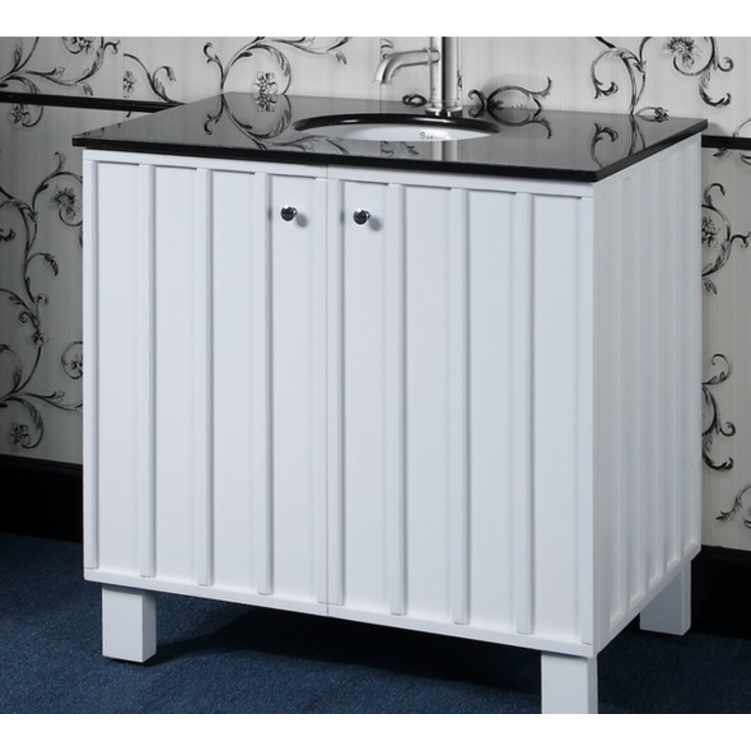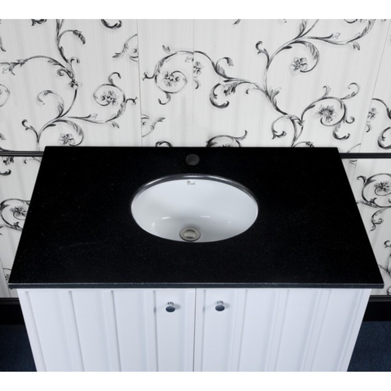 - Type of top: Black granite top with a single sink