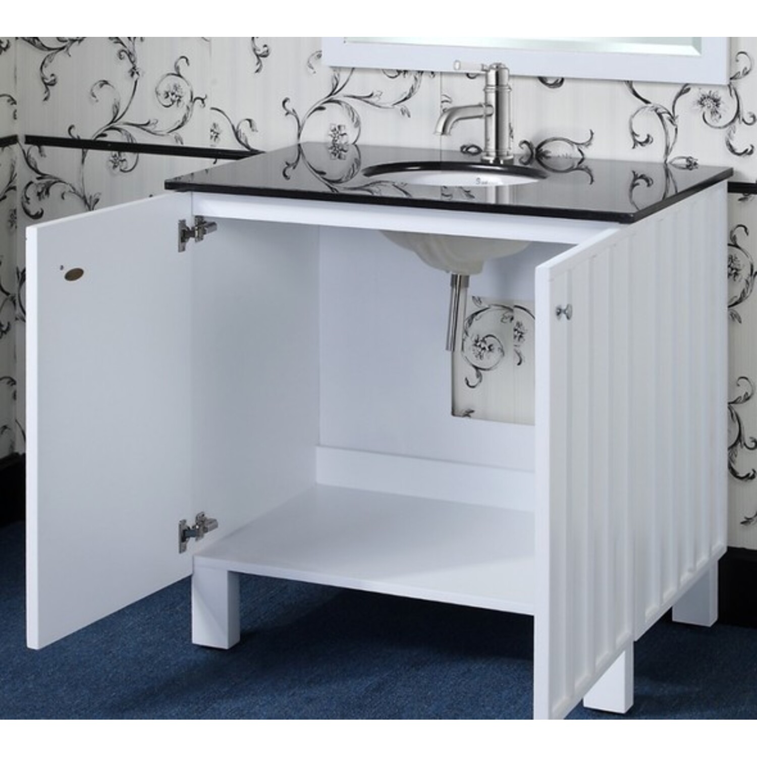 This Country Style Vanity will bring a sense of warmth to any bathroom. It features a black granite top with an under mounted sink. Its soft-closing double-door with plenty room for storage and matching framed beveled edge wall mirror are included to complete the look.
